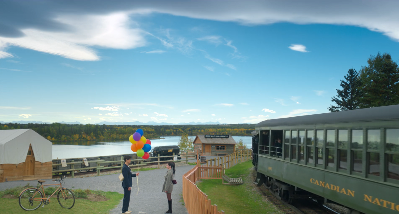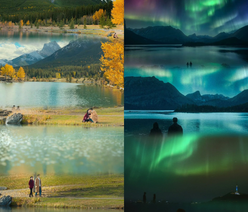 Một trong những khung cảnh để lại nhiều dư âm chính là Vườn quốc gia Banff. Được thành lập từ năm 1885 và UNESCO công nhận là Di sản Thế giới, Banff mang trong mình vẻ đẹp nguyên sơ của thiên nhiên. Những hồ nước xanh thẳm, đỉnh núi phủ tuyết và thác nước hùng vĩ tạo nên một không gian choáng ngợp. Trên màn ảnh, hồ Louise bước sang thu, khoác lên mình sắc vàng rực rỡ, ấm áp. Đặc biệt, cực quang tại Banff mang đến cho hai nhân vật một trải nghiệm đáng nhớ, khi những dải ánh sáng nhiều màu uốn lượn trên bầu trời đêm, tạo nên một khung cảnh hiếm có, đầy mê hoặc.