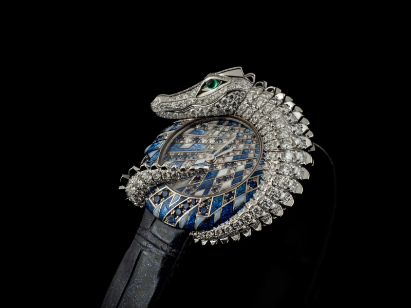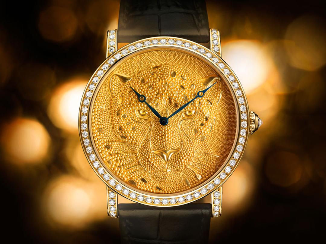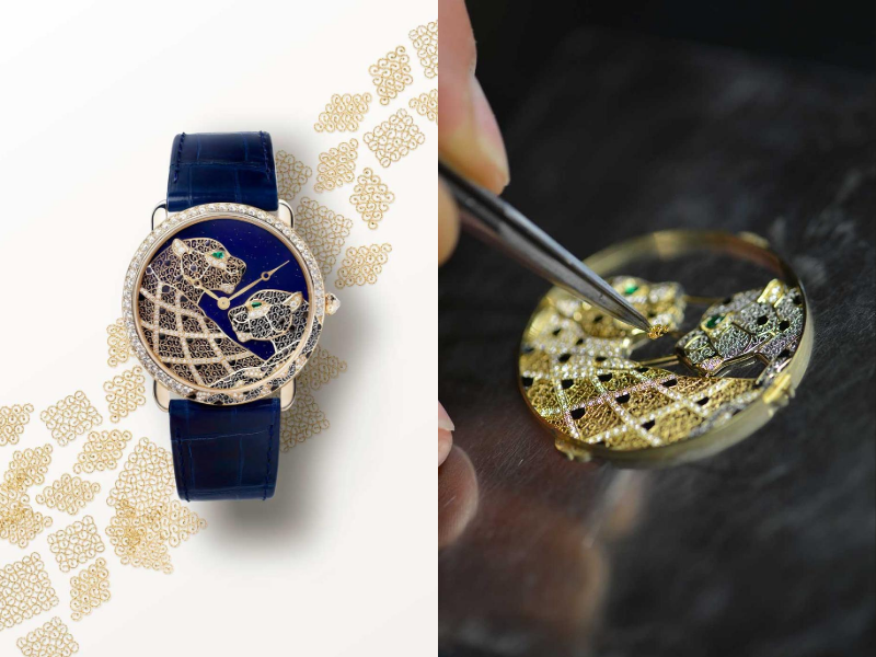 Năm 2015, Cartier đã đưa các tấm “ren kim loại” này trong mẫu Ronde Louis Cartier XL. Ở đó, hình ảnh hai con báo gấm trên nền sơn mài và nạm đá được chế tác các sợi kim loại siêu nhỏ. Riêng công đoạn filigree đã đòi hỏi khoảng 10 ngày chế tác tỉ mỉ, đồng thời yêu cầu chế tạo các công cụ chuyên dụng để xử lý vật liệu ở kích thước vi mô. Vàng và bạch kim được kéo thành những sợi mảnh, đan kết thành cấu trúc gợi hình thân thể loài báo, trong khi các chi tiết như đốm lông được hoàn thiện bằng sơn mài đen và bề mặt được điểm xuyết bằng kim cương. Ánh nhìn của hai hình tượng được nhấn bằng sắc xanh lục bảo, tạo nên một điểm hội tụ thị giác trên tổng thể bố cục.