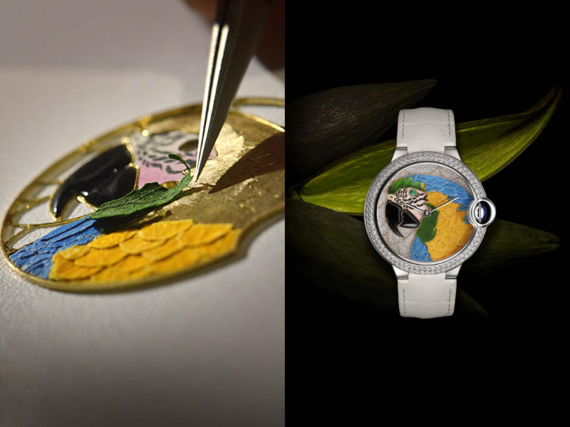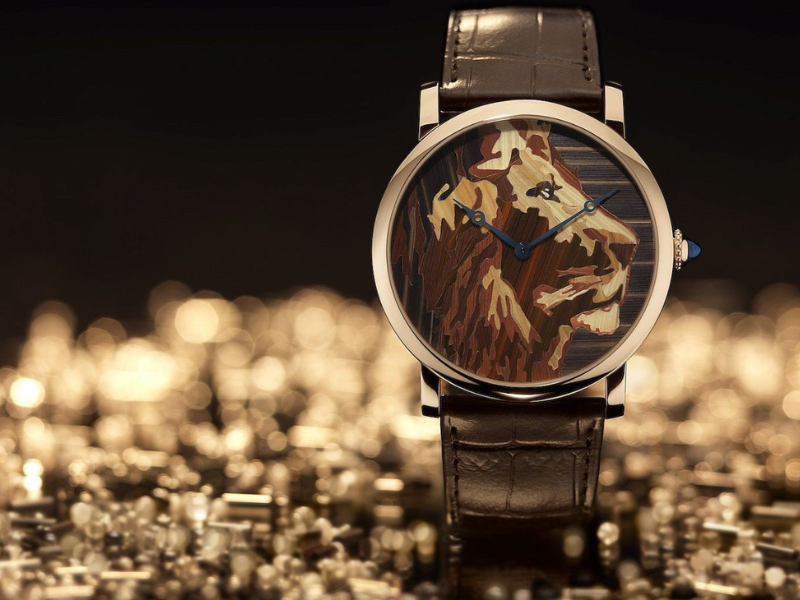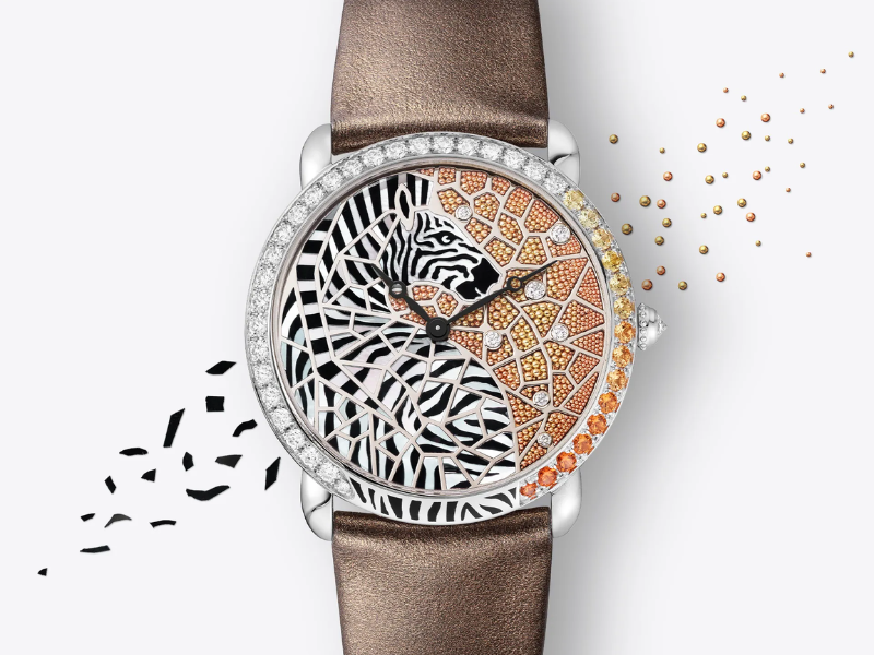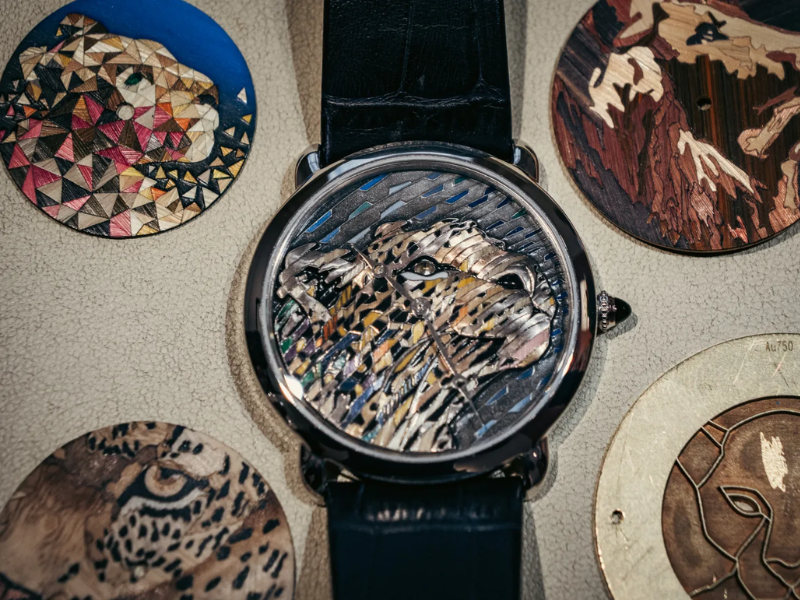 Có thể nói, mặt số đồng hồ là nơi các bố cục của Cartier bộc lộ rõ cơ chế vận hành nhất, trong sự giao thoa giữa các kỹ thuật cổ như khảm gỗ, khảm rơm và khảm đá, khi chúng được chuyển vào quy mô tiểu họa. Năm 2014, có một phương pháp mới được đưa vào hệ thống kỹ thuật của Maison, đó là khảm hoa. Quy trình bắt đầu từ việc thu thập cánh hoa thật, sau đó xử lý, nhuộm màu và cắt thành từng phần nhỏ. Những mảnh hoa này được đặt lên một lớp gỗ mỏng bằng cưa khảm hình “nỏ”, từng bước cố định theo bố cục đã được xác lập từ trước. Khi hoàn tất, bề mặt mặt số trở thành nơi các mảnh vật liệu hội tụ, mỗi chi tiết tham gia vào việc định hình hình ảnh chung.