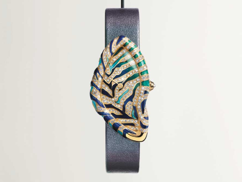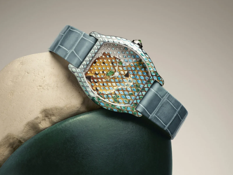 Kỹ nghệ này được chiêm ngưỡng rõ trên mẫu Tortue, nơi hình tượng báo gấm được cấu thành từ các vùng men phân tách theo rãnh khắc. Tổng thời gian dành cho phần tráng men của mặt số và vỏ đạt khoảng 130 giờ, với 14 lần nung liên tiếp với mỗi lần nung đặt ra một điều kiện riêng về nhiệt độ nhất định. Sau khi hoàn tất phần men, công đoạn nạm đá tiếp tục được thực hiện, trong đó đôi mắt của báo sử dụng tsavorite và onyx, với thời gian hoàn thiện khoảng 3 giờ.