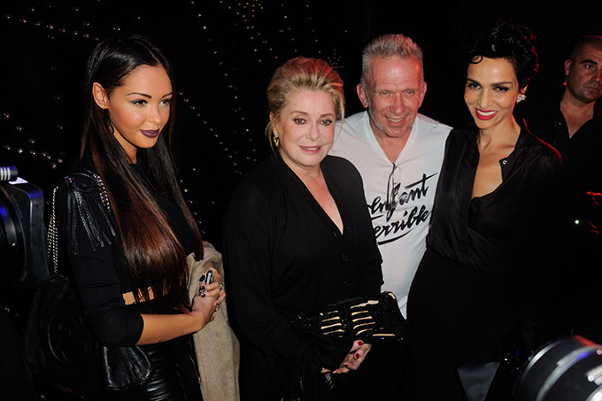 Từ trái sang phải, ngôi sao truyền hình Nabilla, nữ diễn viên nổi tiếng Catherine Deneuve, NTK Jean Paul Gaultier và Farida Khelfa trong show diễn của Jean Paul Gaultier.