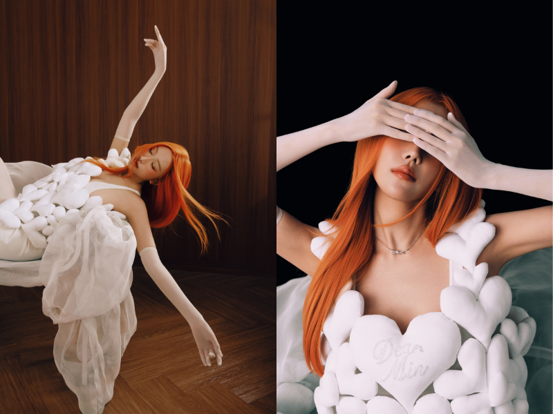 Cấu trúc “roof-heart” này đại diện cho “Dear Min”, nơi cảm xúc được soi rọi, nhưng cũng là nơi ta phải đối diện với chính mình. Nữ ca sĩ đứng giữa, trên bục hình trái tim, chính là điểm hội tụ của bản ngã và ký ức, như thể mọi âm thanh, mọi giai điệu đều được sinh ra từ nhịp đập của trái tim đó. “Với những bài hát mang nhiều nỗi niềm, tôi không thể đóng vai mà phải thật sự sống lại trong cảm xúc đó. Có những lúc khi thu âm, tôi phải dừng lại, hít thở, rồi mới có thể tiếp tục. Nhưng chính điều đó làm cho sản phẩm lần này chân thật hơn. Nó không chỉ là âm nhạc, mà là lời tự sự”, MIN bày tỏ.
