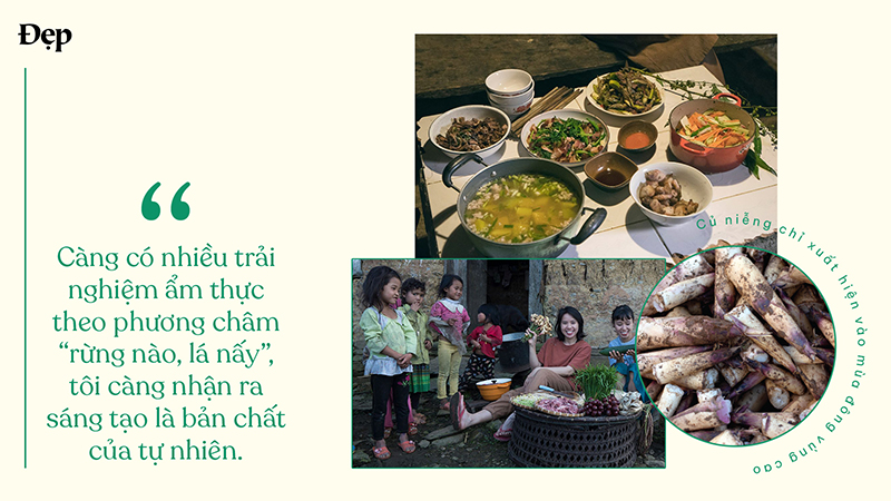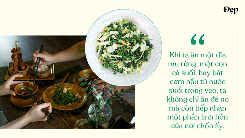 Nếu từng xem “Little forest”, hẳn bạn cũng ước ao một lần được sống trong căn nhà gỗ xinh xắn giữa rừng, tự tay chuẩn bị món ăn từ những gì tự trồng hoặc hái quanh nhà như nhân vật chính Ichiko. Lần gần đây nhất chúng tôi vào rừng là ở Lạc Dương (Lâm Đồng). Ở đó, tôi gặp một cậu quản rừng dễ mến. Ngày nào cậu cũng cưỡi chiếc Dream cũ xì chỉ còn mỗi cái khung, chạy bon bon trên con đường đất đá để ra chợ mua những nguyên liệu tươi nhất từ bà con. Buổi trưa, cậu nấu cơm với món chiên, món kho, rau xào, canh nóng. Tối đến, cậu lại bày cháo gà, lẩu vịt, lẩu cá thơm lừng. Có hôm, cậu nhờ mấy anh em đồng bào lội ngược suối vào tận rừng sâu để chài cá. Cậu làm tôi nhớ đến câu “rừng nào, lá nấy”. Ấy là câu thành ngữ dân gian ẩn chứa triết lý về sự hài hòa, thích nghi và phát triển bền vững. Ngoài ra, nó còn mang một nghĩa đời thường hơn: con người sống nhờ vào những thức quà đất trời ban tặng. Mỗi món ăn là một lát cắt của đất trời, là sự kết tinh của khí hậu, thổ nhưỡng và bàn tay con người. Khi ta ăn một đĩa rau rừng, một con cá suối, hay bát cơm nấu từ nước suối trong veo, ta không chỉ ăn để no mà còn tiếp nhận một phần linh hồn của nơi chốn ấy.