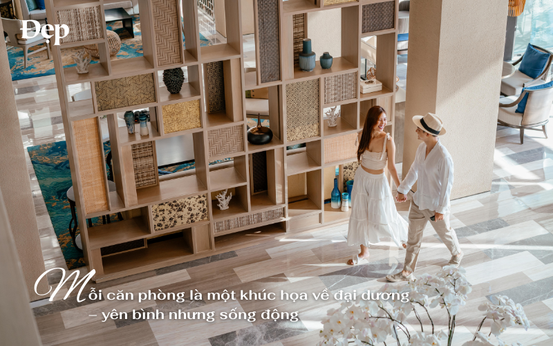 Bước vào không gian lưu trú, du khách như ghé thăm một tác phẩm điêu khắc của biển: những đường cong uốn lượn, sắc lam loang như sóng, điểm xuyết họa tiết san hô, vỏ sò và đá tự nhiên. Mỗi căn phòng là một khúc họa về đại dương – yên bình nhưng sống động. Tuyệt nhiên không có cảm giác choáng ngợp, thay vào đó là sự ôm ấp, quyến luyến trong những vòng cảm xúc vô hình.