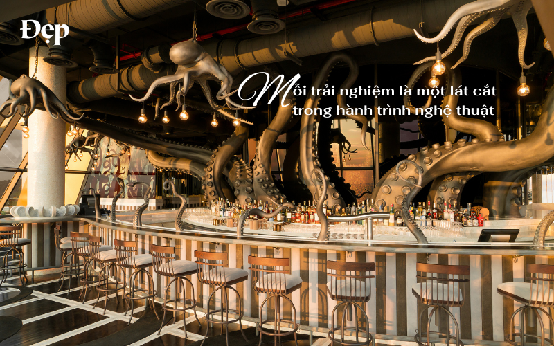 Tại LAVA, quầy bar san hô hóa thạch như kết tinh tinh thần biển cả. Ở INK 360, Kraken vươn mình giữa trời nước, nâng ly cocktail hương tiêu Phú Quốc như một nghi thức của cảm xúc. Mỗi trải nghiệm là một lát cắt trong hành trình nghệ thuật mà khu nghỉ dưỡng kiến tạo.
