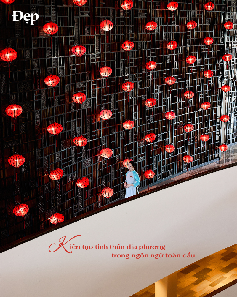 Các mảng tường cát và họa tiết sóng mềm mại phản chiếu ánh sáng như làn nước đang chuyển mình. Chất liệu tre, gỗ, đá tự nhiên đan cài cùng bảng màu xanh lam – be cát – nâu gỗ, gợi lại triết lý “sống cùng thiên nhiên” đặc trưng của kiến trúc sư Võ Trọng Nghĩa.