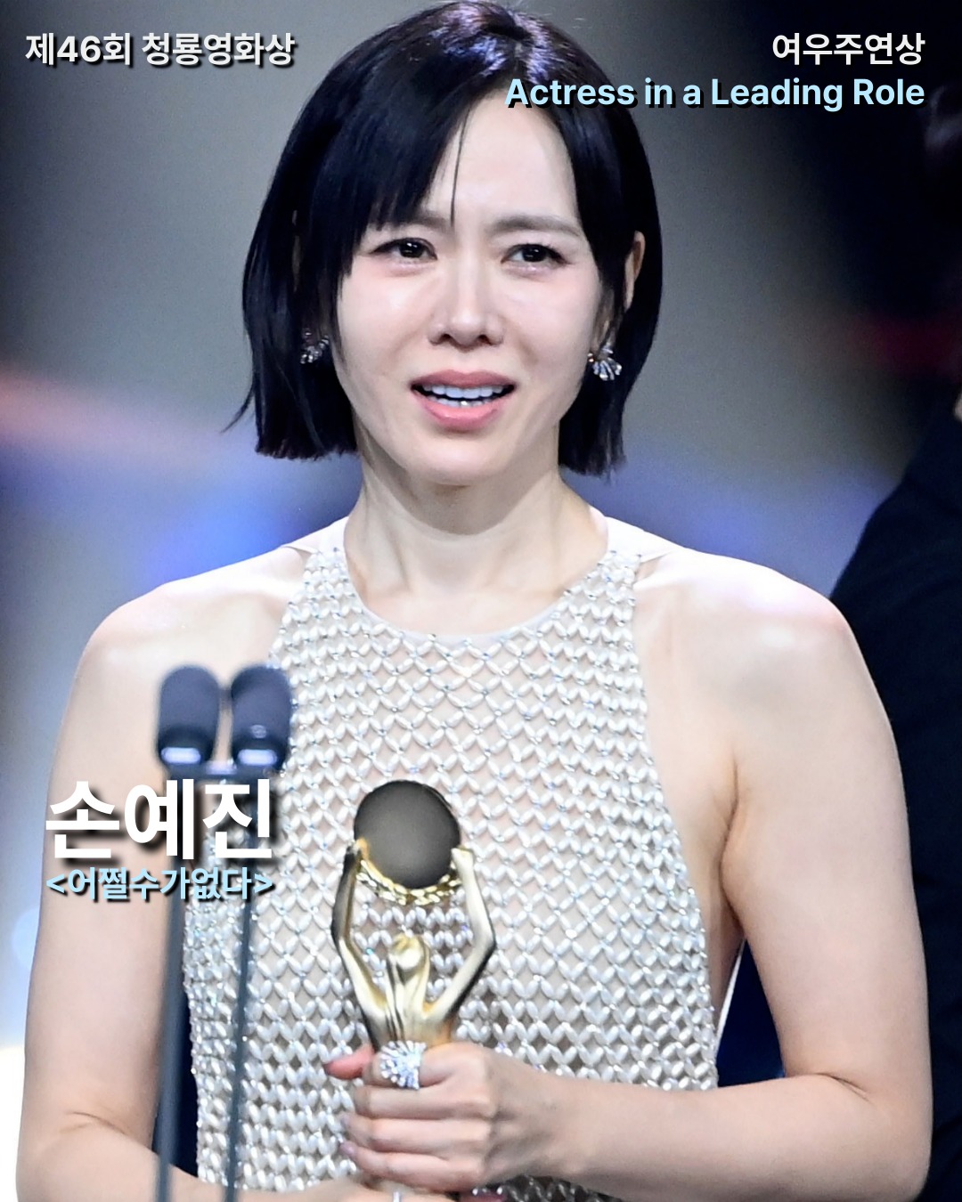 Trong khi đó, Son Ye Jin bước vào mùa giải với vị thế ứng cử viên sáng giá nhờ màn thể hiện thuyết phục trong “No Other Choice”. Cô vào vai một người phụ nữ bị cuốn vào bi kịch gia đình và những xung đột không thể tháo gỡ. Vai diễn cho phép cô phô bày chiều sâu nội tâm bằng nhịp diễn tiết chế nhưng giàu sức nặng, vì vậy chiến thắng của cô không tạo bất ngờ. Đây là lần thứ hai cô nhận danh hiệu “Nữ chính xuất sắc nhất” Rồng Xanh sau “My Wife Got Married” năm 2008.