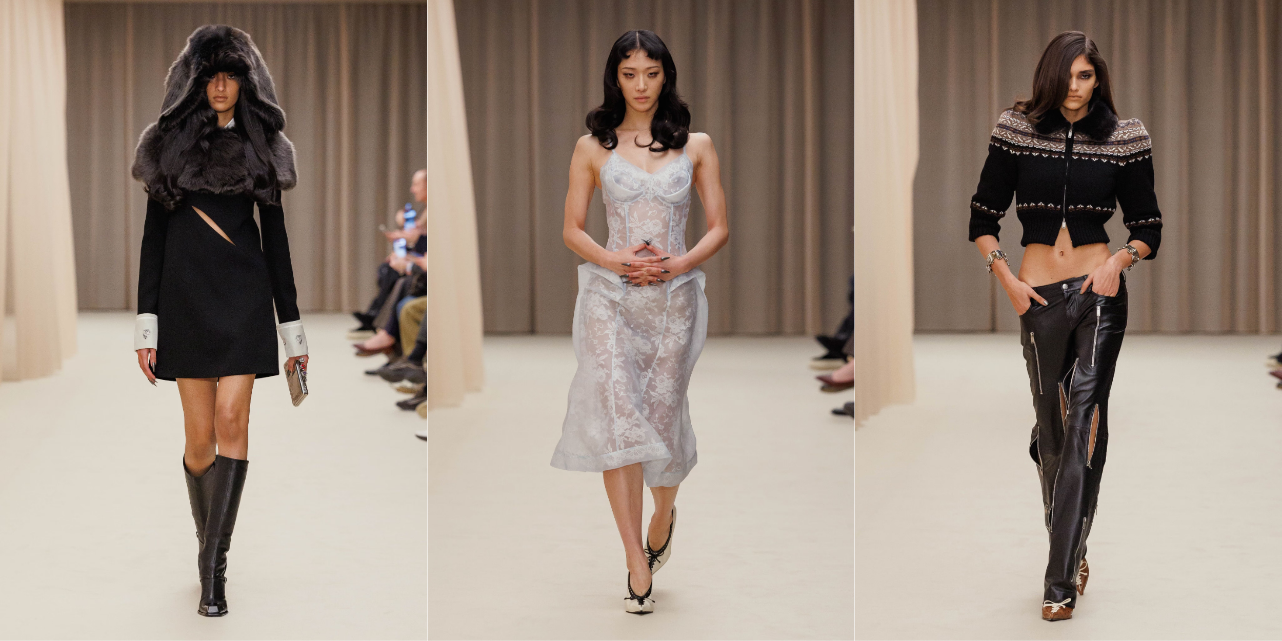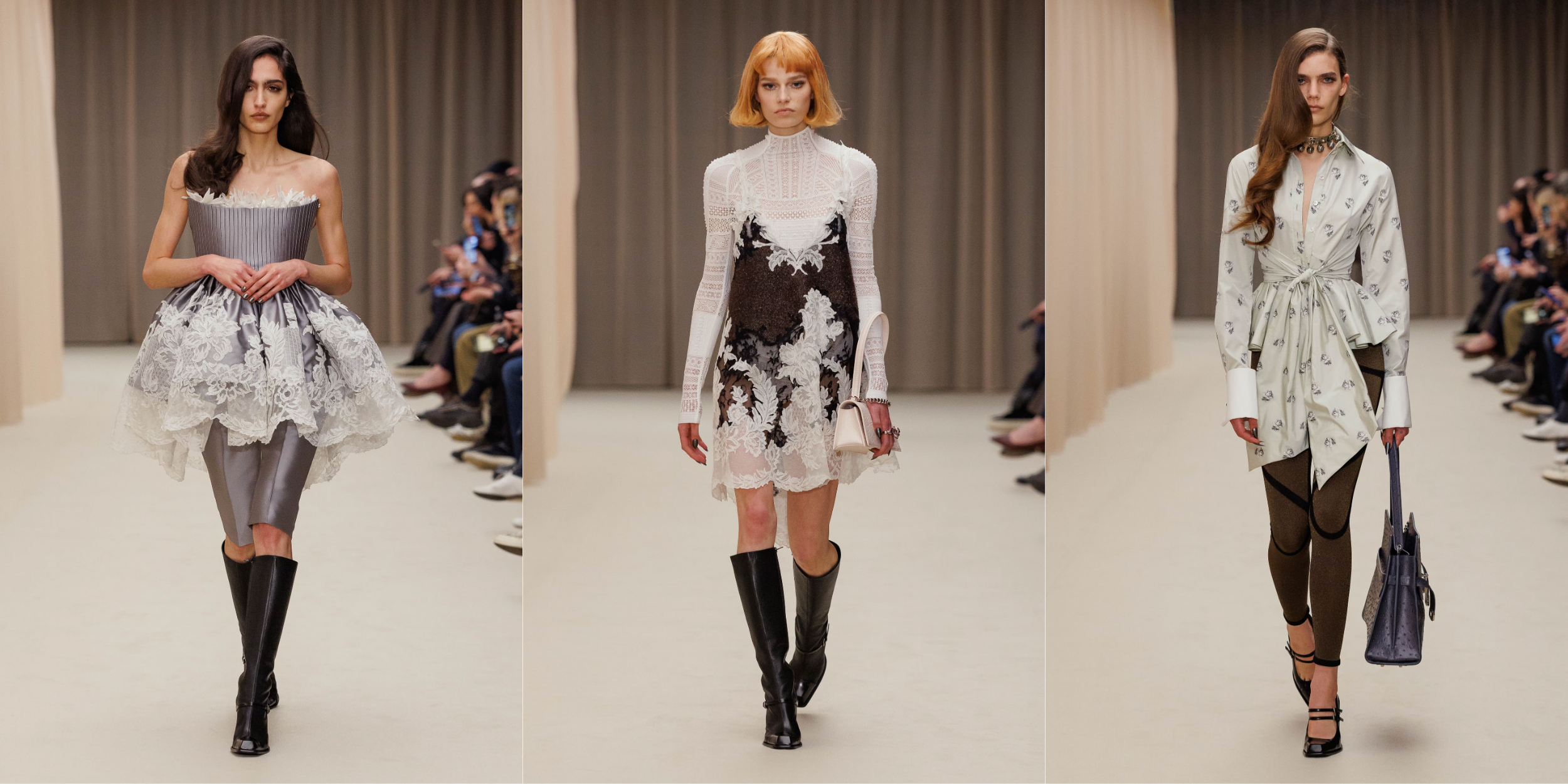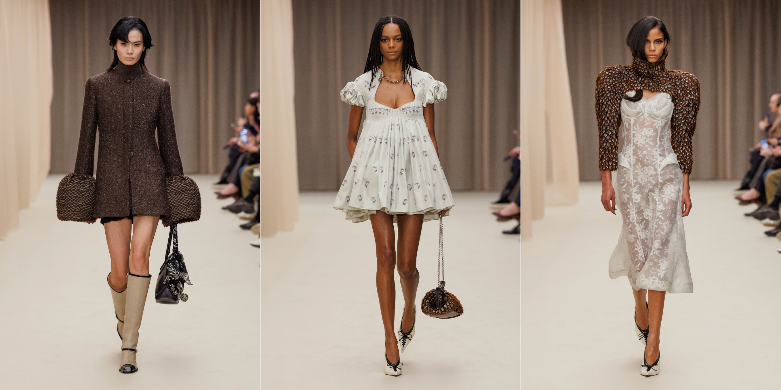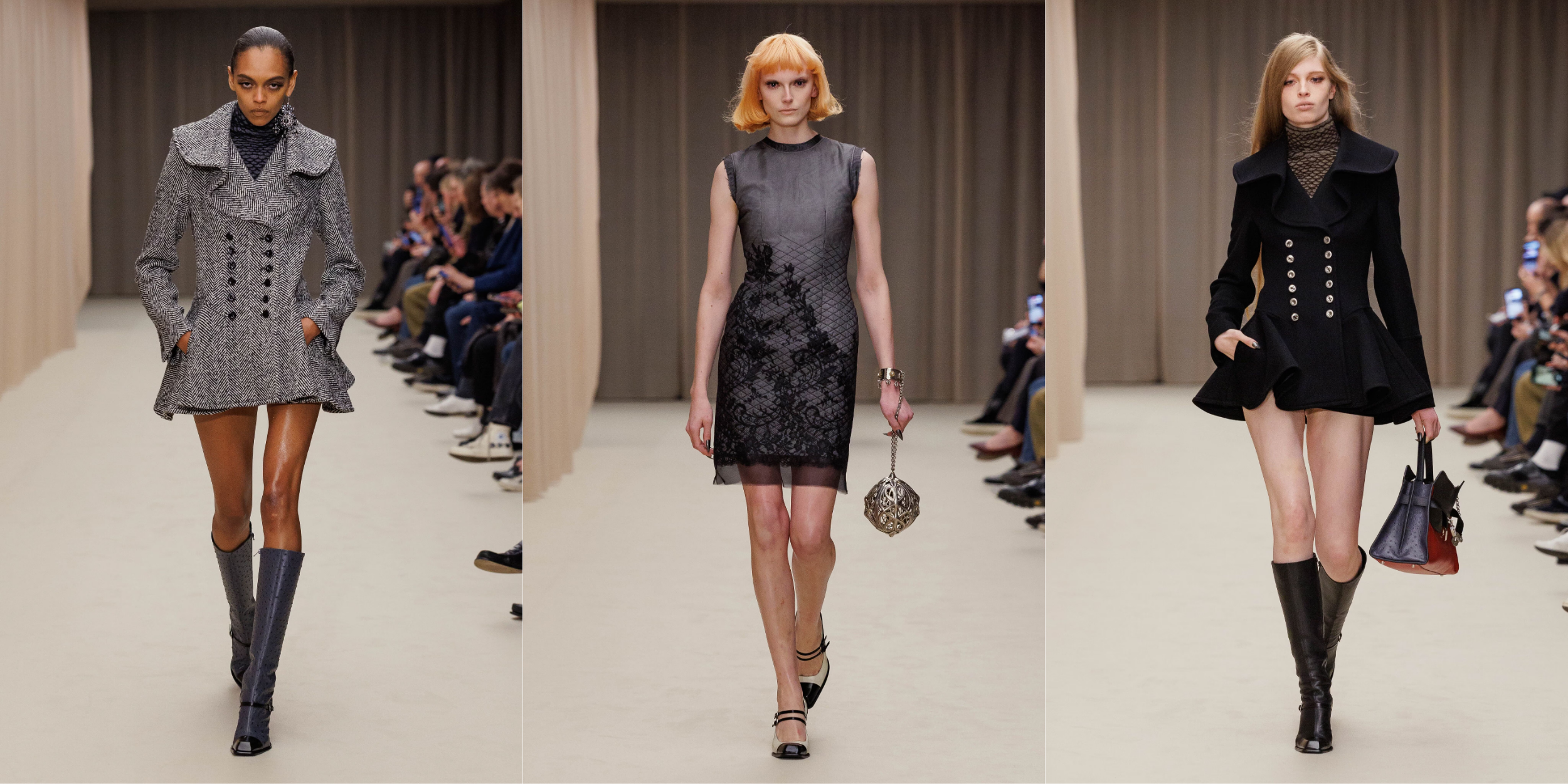 Vẫn là cái chất trình diễn đặc trưng, show diễn khởi động với các thiết kế peacoat được mặc như những chiếc đầm siêu ngắn, với phần cổ gothic được cách điệu gợi nhắc đến hệ thẩm mỹ dưới triều đại Vua Edward VII những năm đầu thế kỷ XX. Các thiết kế đứng phom trong chất tweed dệt xương cá loang màu và sắc đen đặc quánh cổ điển. Tiếp nối là câu chuyện của ren, và chúng dường như bị giữ chặt dưới những lớp organza siêu nhẹ. Những chiếc đầm slip ôm sát cơ thể hay các thiết kế dạ tiệc phủ ren mỏng tang ở lớp ngoài, để lộ lớp nội y thấp thoáng phía bên trong.