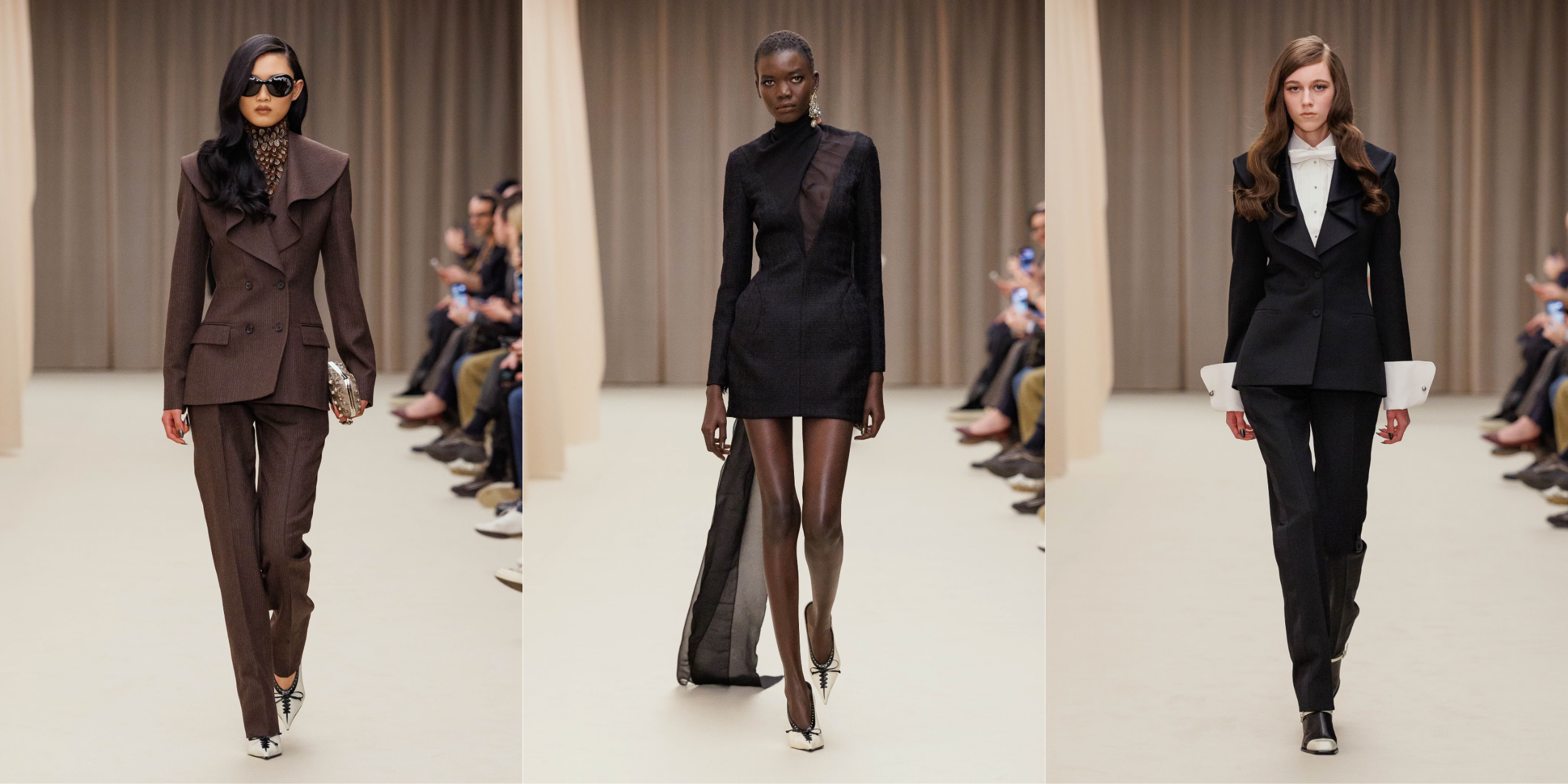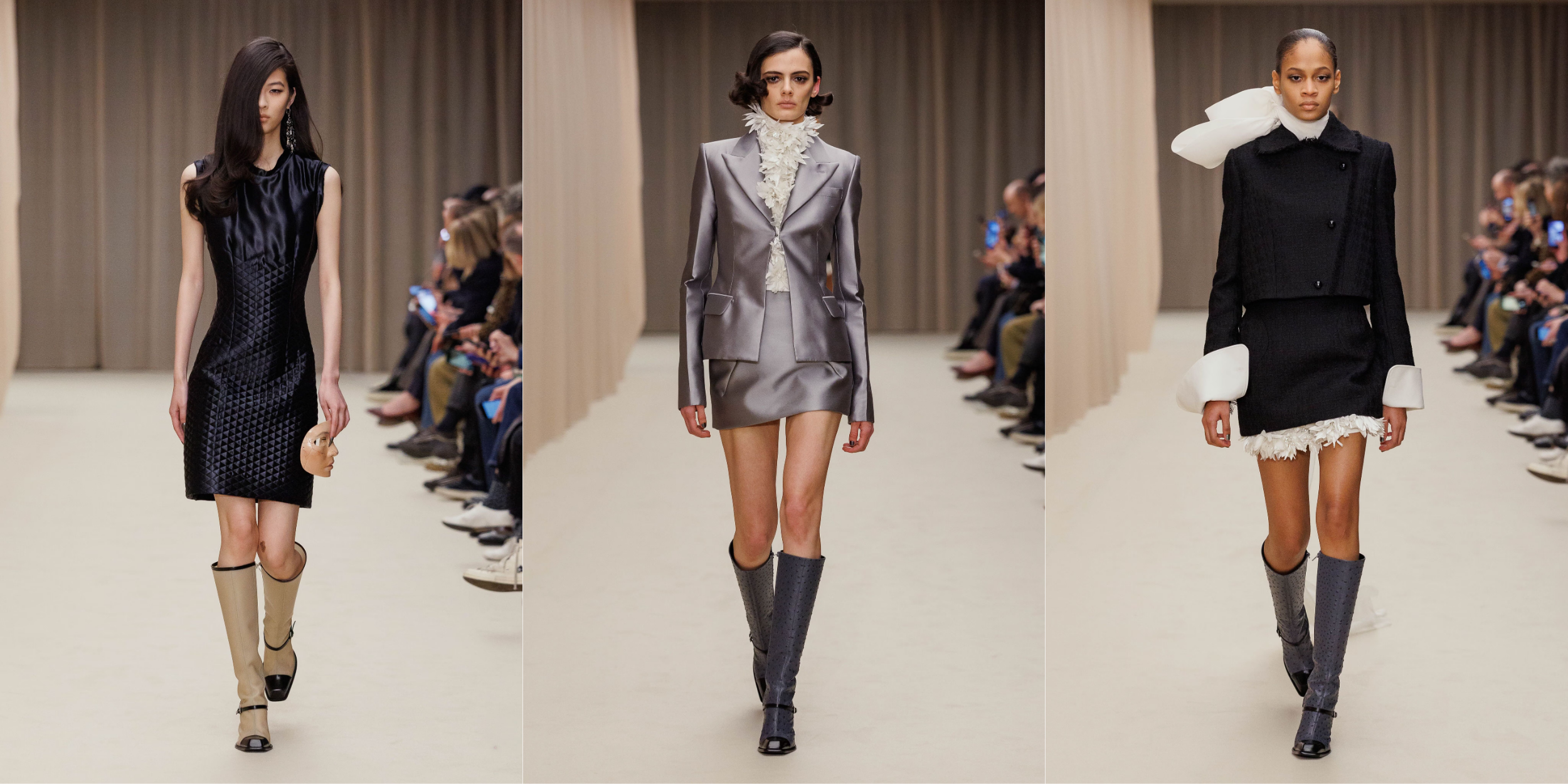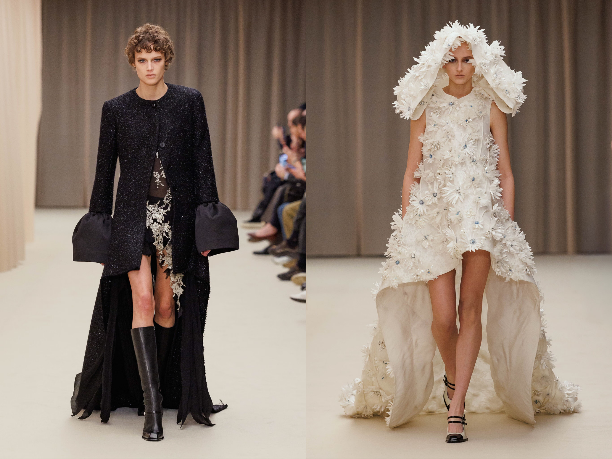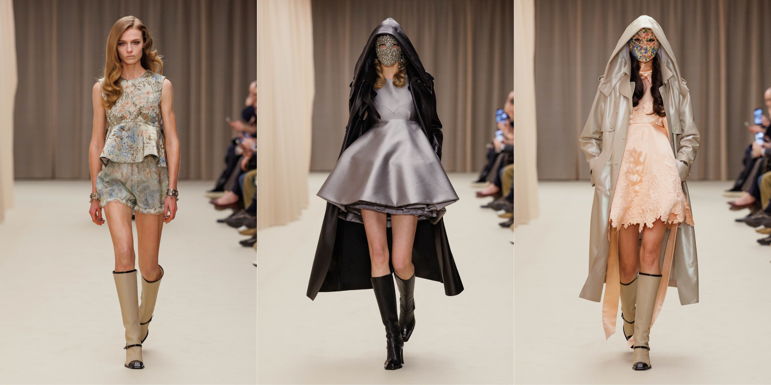Vẫn là cái chất trình diễn đặc trưng, show diễn khởi động với các thiết kế peacoat được mặc như những chiếc đầm siêu ngắn, với phần cổ gothic được cách điệu gợi nhắc đến hệ thẩm mỹ dưới triều đại Vua Edward VII những năm đầu thế kỷ XX. Các thiết kế đứng phom trong chất tweed dệt xương cá loang màu và sắc đen đặc quánh cổ điển. Tiếp nối là câu chuyện của ren, và chúng dường như bị giữ chặt dưới những lớp organza siêu nhẹ. Những chiếc đầm slip ôm sát cơ thể hay các thiết kế dạ tiệc phủ ren mỏng tang ở lớp ngoài, để lộ lớp nội y thấp thoáng phía bên trong.