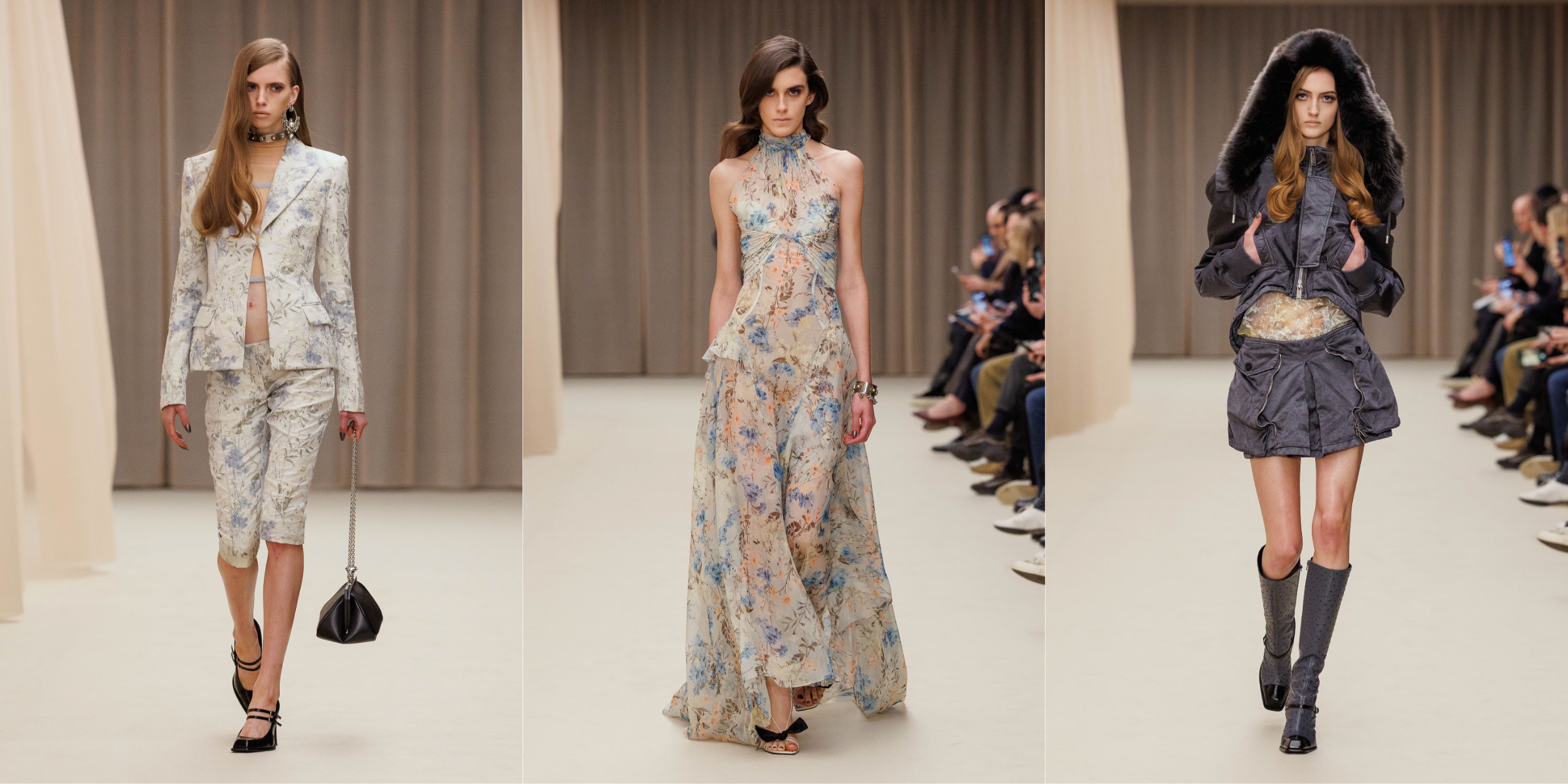 Mùa Thu Đông lần này lấy cảm hứng từ ý niệm về chủ nghĩa hoàn hảo độc hại, từng được gợi mở ở bộ phim “Safe” (1995) của đạo diễn Todd Haynes. Nhưng thực tế, mọi thứ chẳng u ám đến thế. Trong không gian được Tom Scutt tổ chức theo cấu trúc vòng tròn được phủ lấy ánh sáng vàng dịu, khái niệm “vòng trong” và “vòng ngoài” được định đoạt trong chiếc rèm màu da ánh hồng mong manh. Hai vòng ngoài và một vòng tròn bên trong bao quanh bục cao cho người mẫu sải bước. Tấm rèm lấp ló, thanh âm bất an của A.G.Cook vang lên, dàn người mẫu xuất hiện.