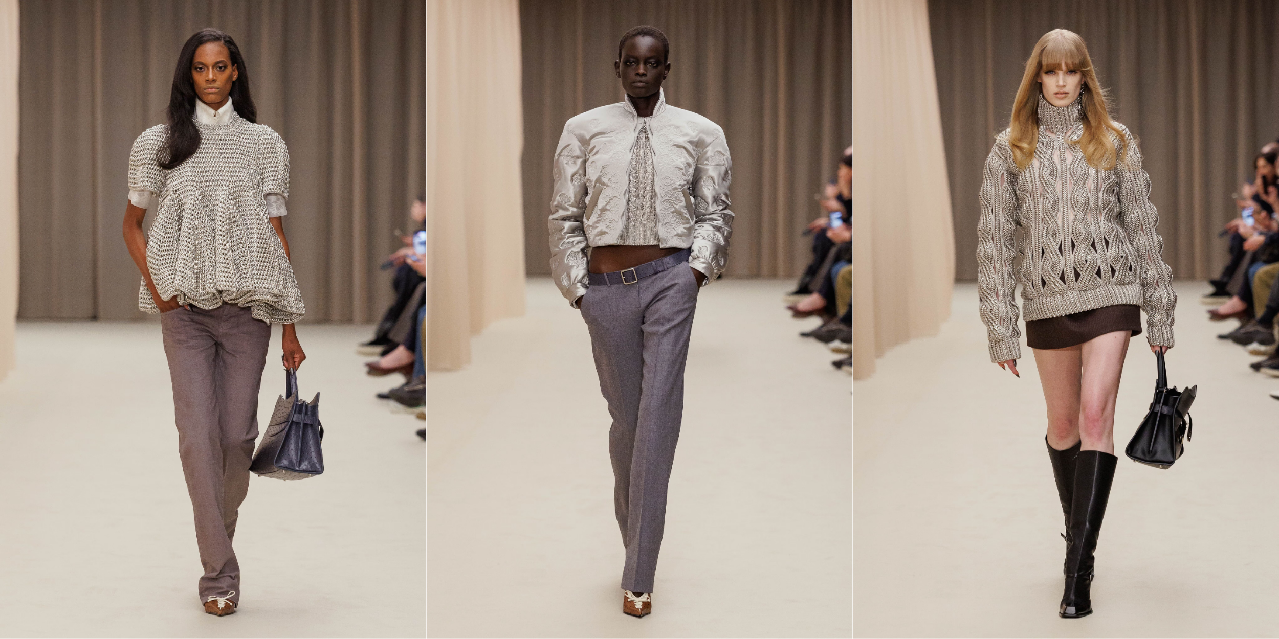 McGirr còn triển khai một chuỗi những màn đánh tráo thị giác, góp phần làm rạn nứt ý niệm về chủ nghĩa hoàn hảo. Một khoảnh khắc ánh kim xuất hiện khi các thiết kế mang sắc kim loại như áo len lấp lánh như bề mặt sắt, áo khoác bay màu bạc, áo khoác trench da ánh ngọc trai đổi màu, chiếc đầm jacquard hoa ép nhăn hay áo blouse xếp ly mang sắc nhôm lạnh. Đồng thời, chất liệu chainmail vốn nặng nề được làm mềm lại khi chuyển hóa thành những chiếc sơ mi poplin hay áo len đan.