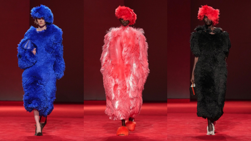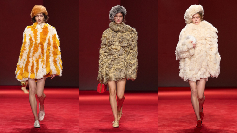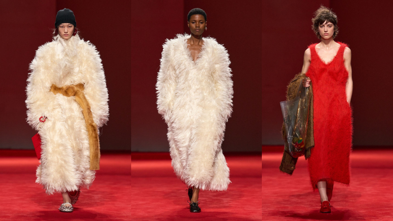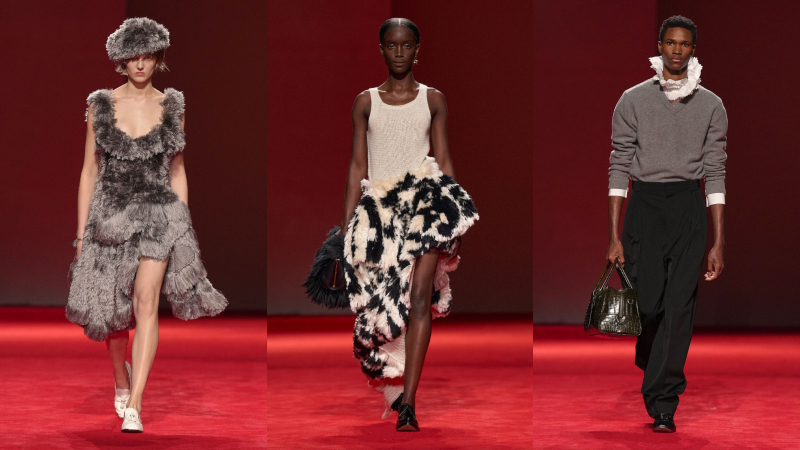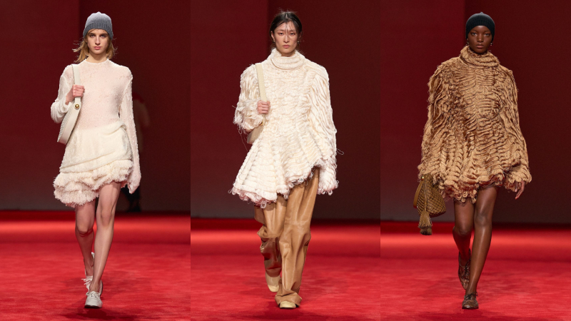 Phụ kiện hoàn thiện gần như mọi bộ trang phục. Mũ len giữ nhịp cho tổng thể; những chiếc mũ tua mang yếu tố trình diễn, gợi nhớ phục trang lãng mạn trong bản chuyển thể “Romeo and Juliet” năm 1968 của Franco Zeffirelli. Đầm và áo khoác dài ngang tunic kết hợp cùng đôi chân trần hoặc quần legging dày.