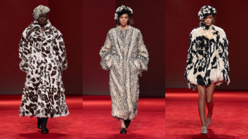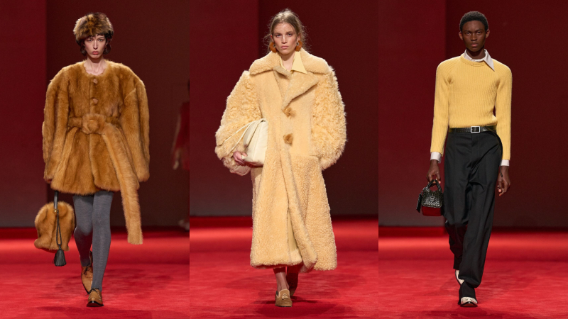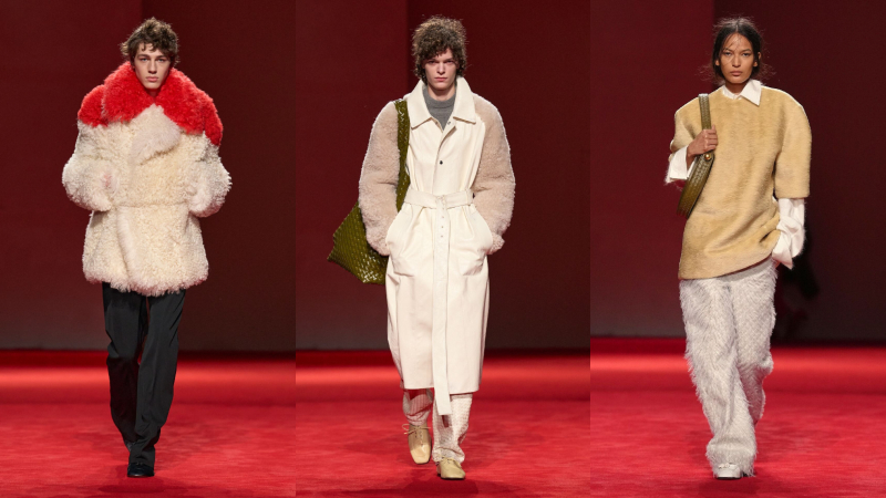 Khi chuỗi thiết kế tiếp diễn, chất liệu dần thay thế phom dáng để trở thành trọng tâm. Chiếc áo peacoat được biến thành một sản phẩm thí nghiệm trên nền da cá sấu xử lý lì, da đan intrecciato bung sợi tua, nhung dày được chạm khắc gợi bề mặt lông cừu xoăn astrakhan. Ở đây, bề mặt và cảm nhận không còn trùng khít. Louise Trotter đã mô phỏng lông thú và da ngoại lai mà không sao chép cách đối thoại khái niệm với di sản của Bottega Veneta như một nhà mốt chuyên về da thuộc. Sợi tơ được xử lý để gợi hiệu ứng shearling xoăn; shearling thật lại được chải để liên tưởng đến lông cáo. Can thiệp kỹ thuật cũng xuất hiện trên sợi thủy tinh được xử lý thành bề mặt xù, nhuộm hồng bubblegum và chạm mắt cá chân khi chuyển động.