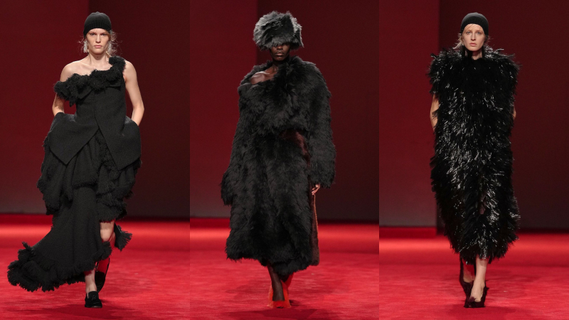 Lõi gợi cảm của bộ sưu tập là một tuyên ngôn được chưng cất đến mức tối giản. Chân váy tua bất đối xứng đen–trắng xoắn dọc theo ống chân đi cùng áo tank dệt kim giản lược. Trong một “đội hình” dày đặc thử nghiệm bề mặt, cách kết hợp này cho thấy sức mạnh của việc tiết giảm. Chuyển động được tạo ra từ đường cắt, thay vì từ chất liệu.