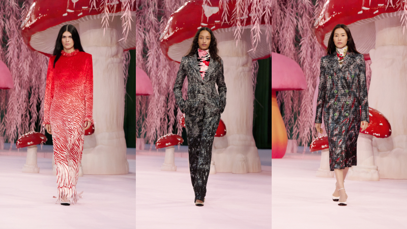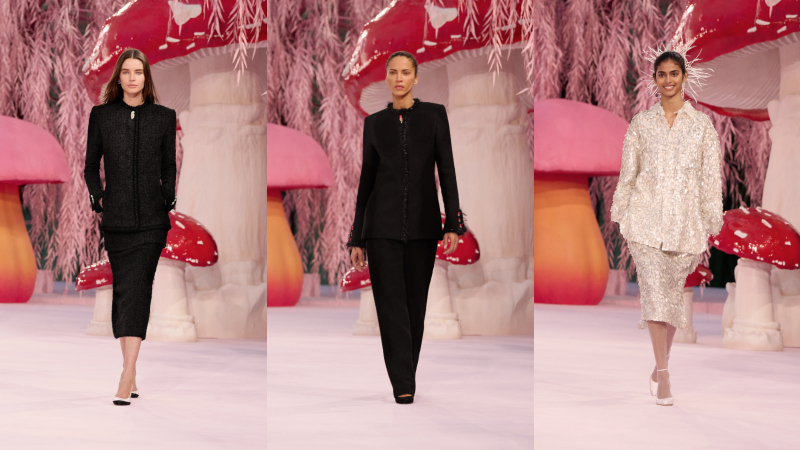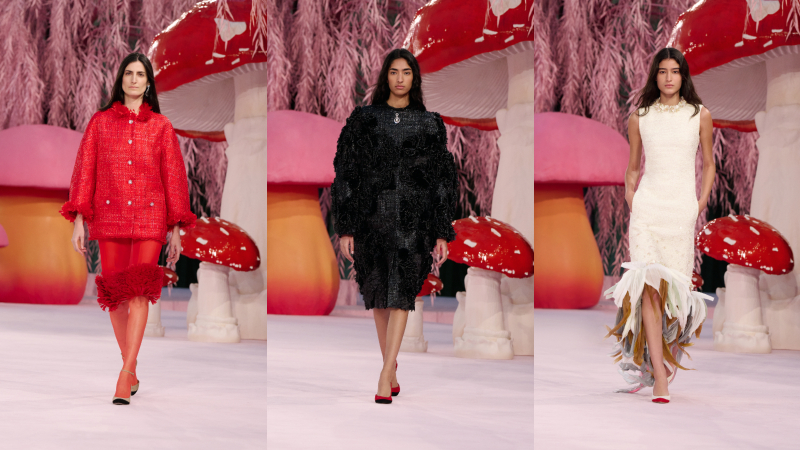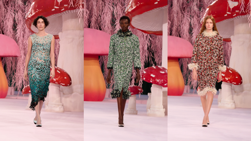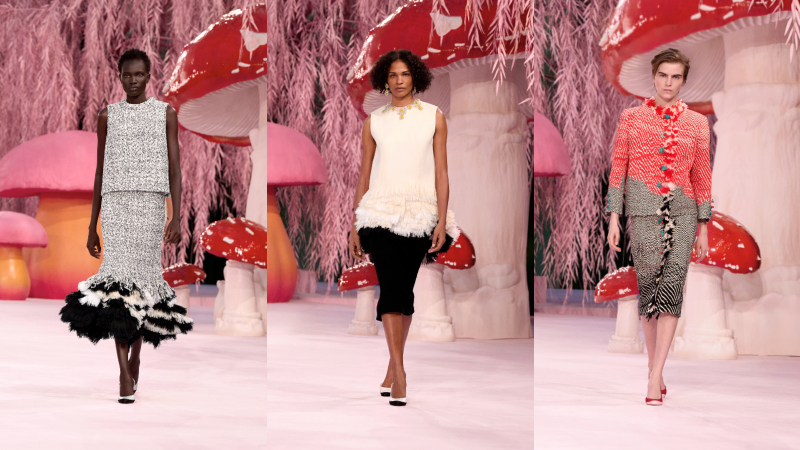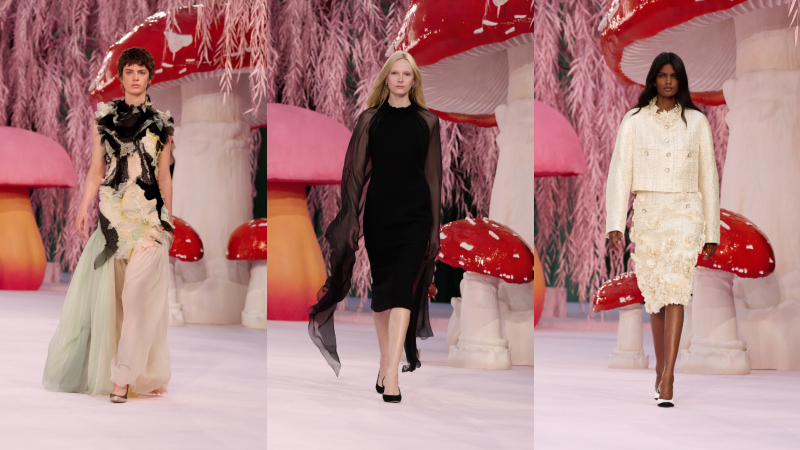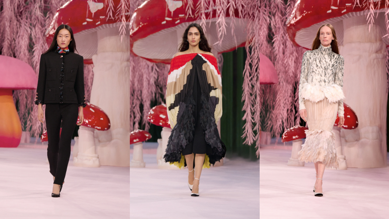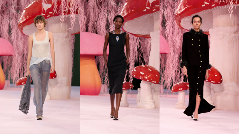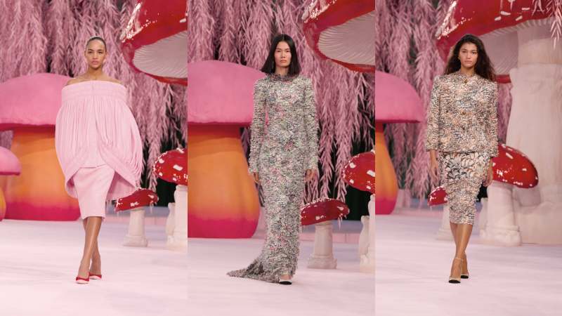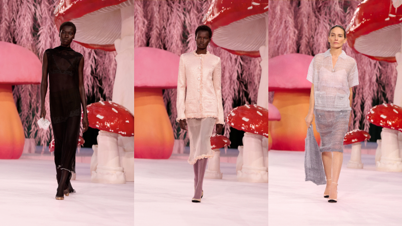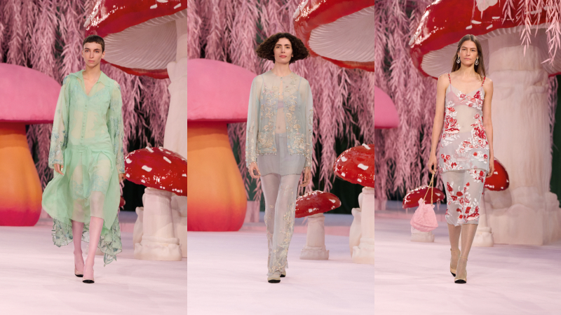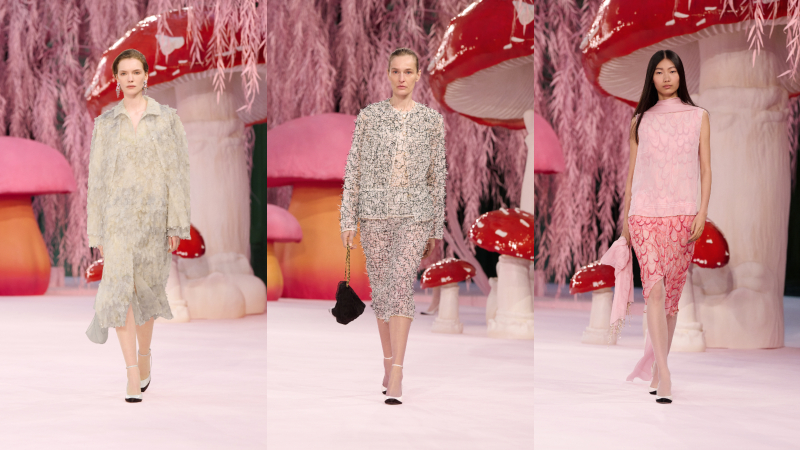 Thay vì tìm cách diễn giải sức nặng kỳ vọng từ di sản của nhà mốt, Matthieu Blazy đưa khán giả bước vào khu rừng liễu nhuộm hồng, bao quanh những ụ nấm khổng lồ thấm đượm không khí cổ tích. Ở đó, những định kiến về người phụ nữ tồn đọng đến hôm nay được nâng đỡ bằng chuyển động của gió xuân.
