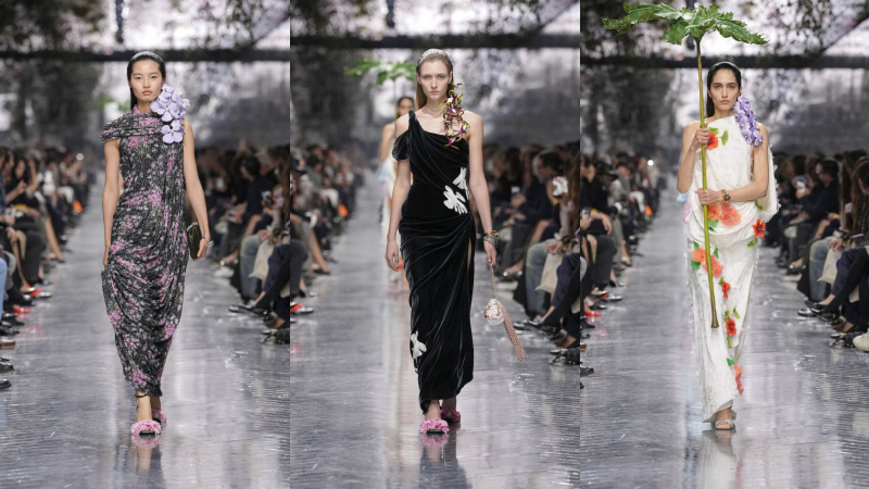 Bộ sưu tập Dior Haute Couture Xuân Hè 2026 cho thấy cách Anderson mở rộng biên độ làm việc của các thợ thủ công lành nghề tại Dior. Màn mở đầu gồm các thiết kế xếp ly với khối dáng tròn, gợi liên tưởng đến những bình gốm tạo hình thủ công của Odundo, đòi hỏi kiểm soát thể tích và trọng lượng ở mức cao. Tiếp đó là áo khoác dáng đồng hồ cát, đầm gấp nếp phủ hàng nghìn cánh hoa vải siêu nhỏ, cùng các cấu trúc trong suốt xoáy theo logic hình học tự nhiên. Một điểm nhấn kỹ thuật đáng chú ý ở bộ sưu tập mùa này là hiệu ứng “cánh bướm”, tạo nên từ các lớp vảy nhẹ, mô phỏng hình ảnh quan sát thiên nhiên qua ống kính phóng đại. Bộ sưu tập còn tích hợp cổ vật một cách khéo léo, chẳng hạn như tranh chân dung thu nhỏ thế kỷ XVIII của Rosalba Carriera được ghim trên khăn choàng; ví cầm tay bọc vải từ thời Marie Antoinette; trang sức đính thiên thạch và hóa thạch, đặt yếu tố địa chất cạnh trang phục.