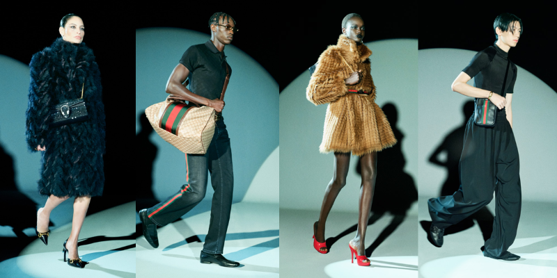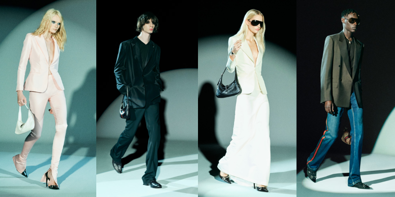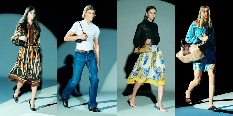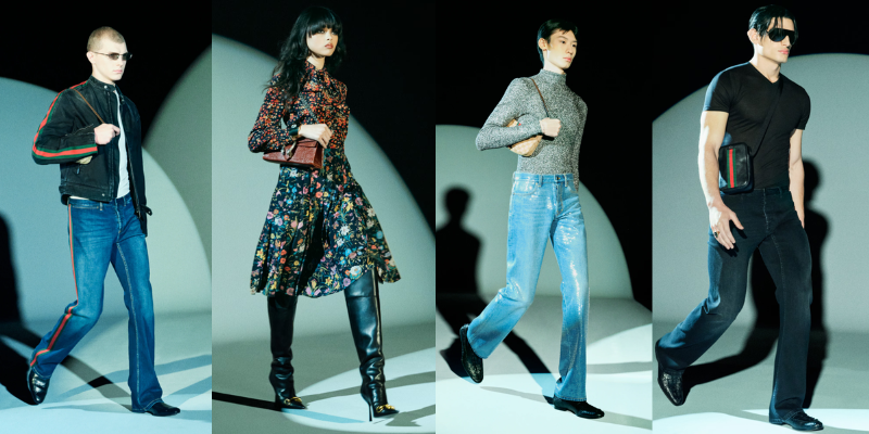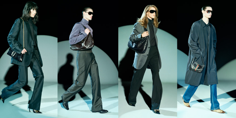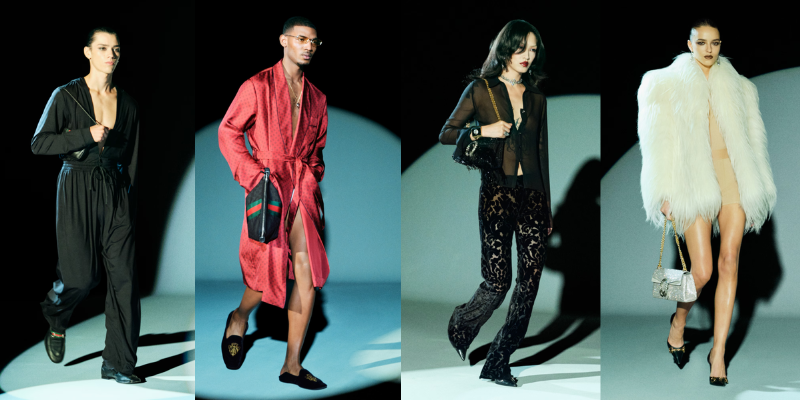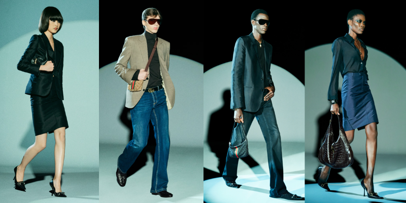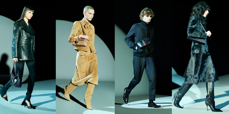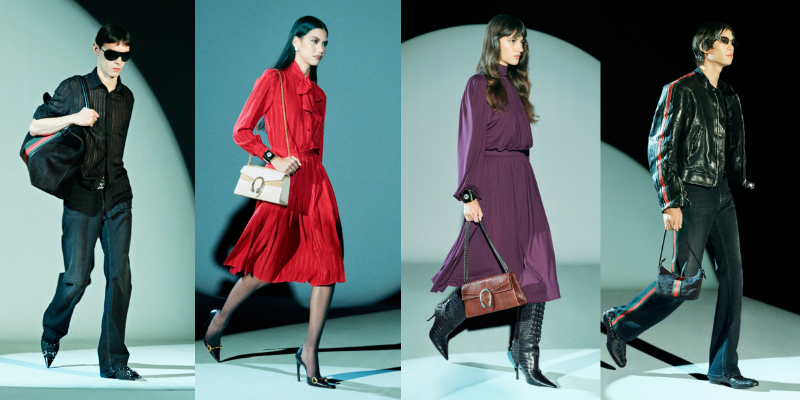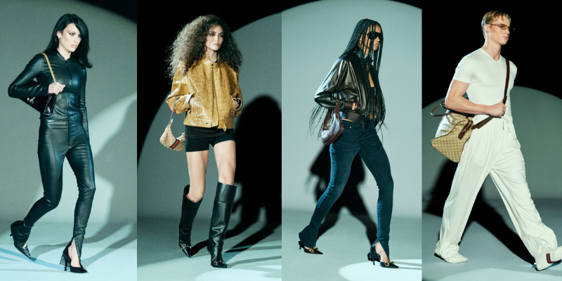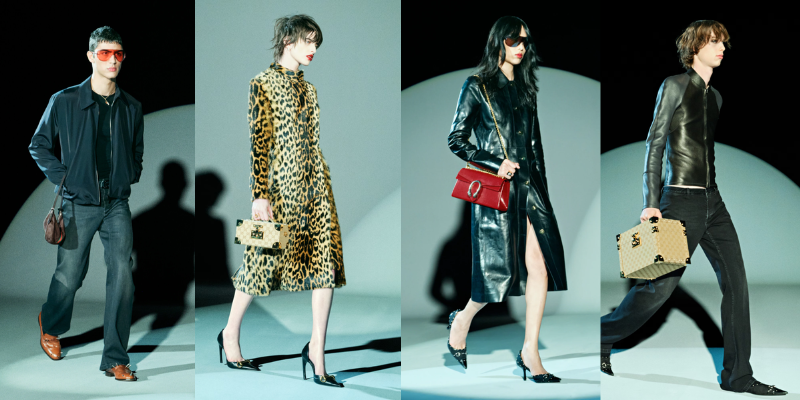 Bộ sưu tập cũng tái hiện các dấu ấn nổi bật của Gucci trong thập niên 70 và 90. Áo khoác racer xuất hiện với sọc Web đặc trưng, trong khi thắt lưng ra mắt cách diễn giải mới của mặt khóa Double G được “cắt xẻ” theo tinh thần hiện đại. Những bộ đồ da và da lộn từ đầu đến chân, song hành cùng các bộ trang phục lụa in họa tiết cưỡi ngựa, lấy cảm hứng trực tiếp từ những chiếc khăn lụa lưu trữ của nhà mốt.