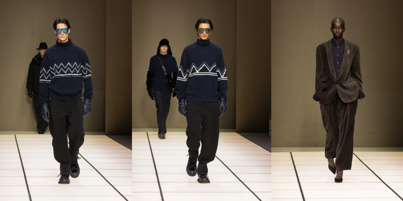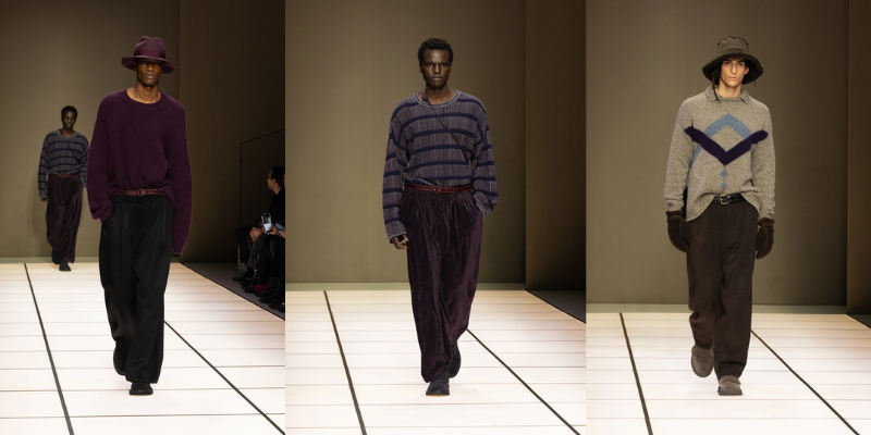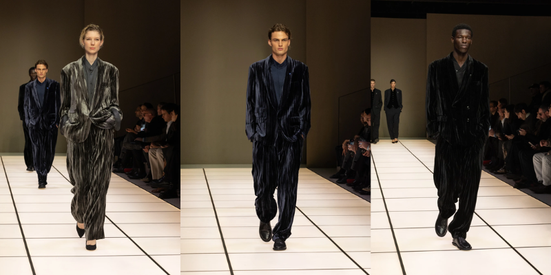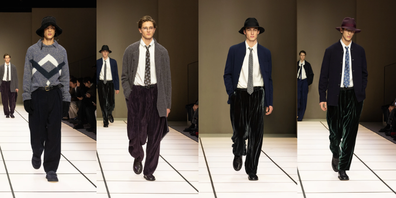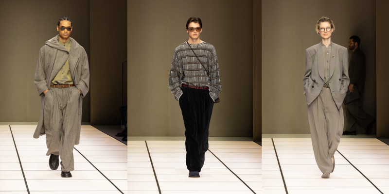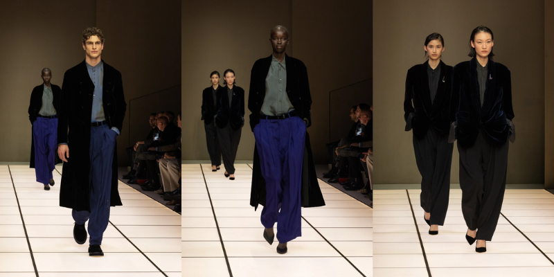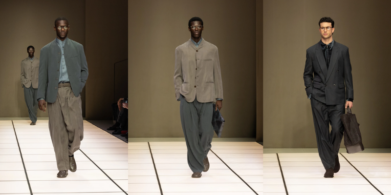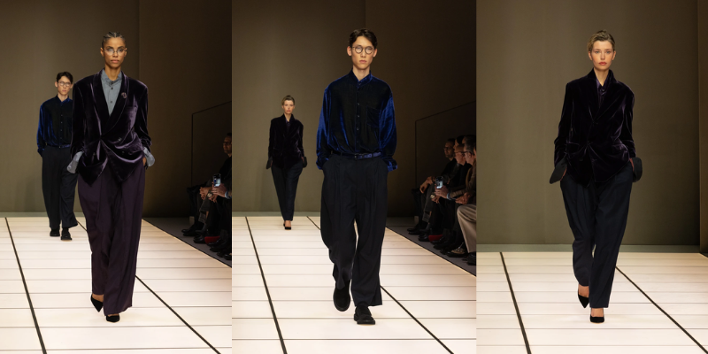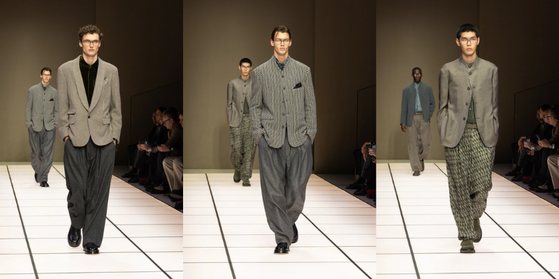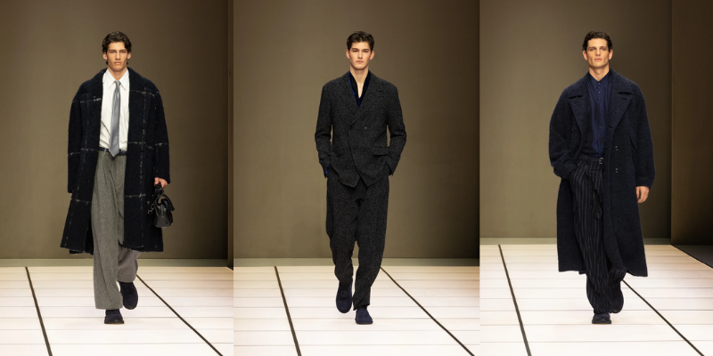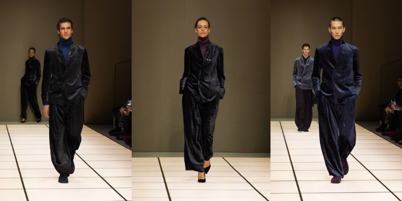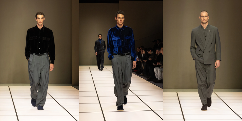 Có thể xem trục chính của bộ sưu tập nằm ở cách xử lý chất liệu và màu sắc. Ở lớp nhìn đầu tiên, Giorgio Armani vẫn hiện diện với những lựa chọn quen thuộc như blazer một và hai hàng khuy, cổ ve choàng hoặc cổ trụ; áo blouson, áo khoác cài nút thấp, áo khoác dáng dài ôm lấy cơ thể; sơ mi có cổ và không cổ; áo cardigan jacquard hình học; cùng quần ống rộng chạm cổ giày và bốt da lộn tạo nên một cảm giác liền mạch.