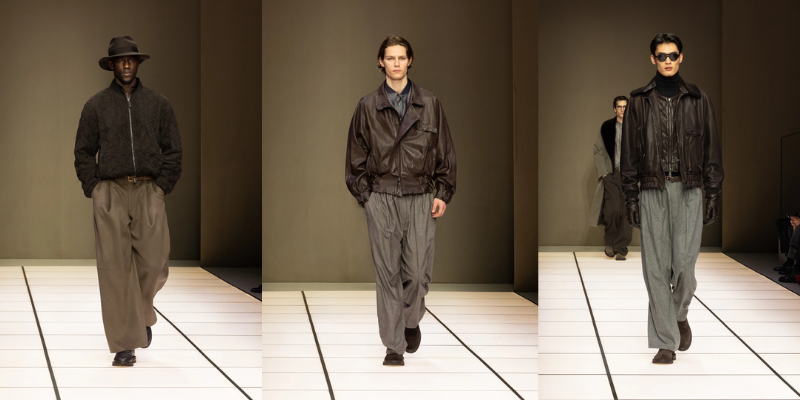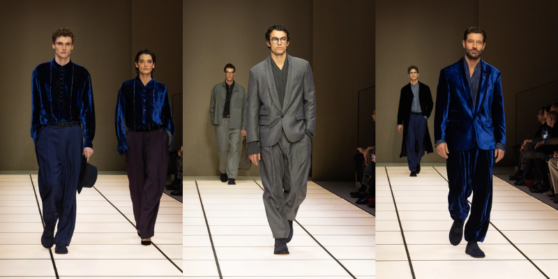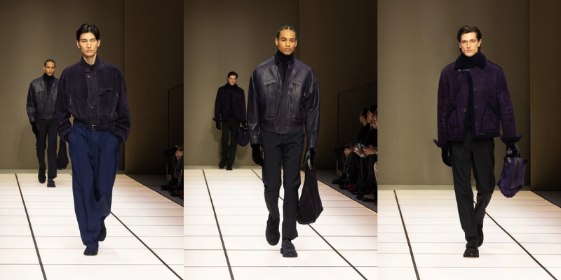 Khi nhắc đến “cangiante” trong bộ sưu tập, chúng ta không thể bỏ qua bảng màu. Những sắc độ như xanh olive, tím thạch anh và xanh lapis lazuli xuất hiện như các điểm nhấn có tính dẫn hướng trên nền xám, be, trung tính, đen và xanh đậm. Phần lớn các gam màu này được đặt vào tổng thể một cách chừng mực, ngoại trừ một bộ suit nhung xanh lam rực, gần chạm tới ranh giới của sự cường điệu. Trong bối cảnh thời trang nam thập niên 80 và 90 đang được tái diễn giải trên sàn diễn năm nay, bộ sưu tập còn gửi gắm tinh thần trẻ qua những chiếc áo khoác bomber và áo khoác phi công dày dặn, cùng áo len rộng với vai trễ được sơ vin vào quần ống lớn.