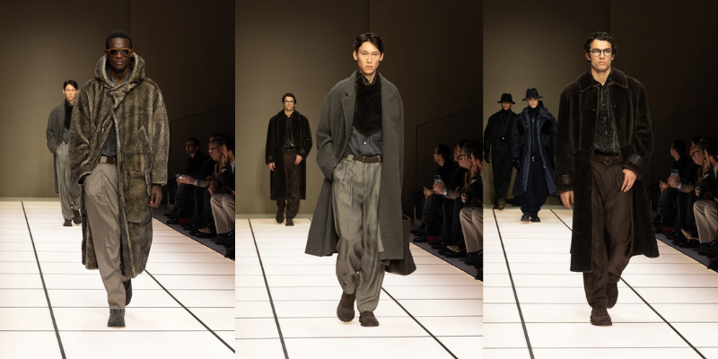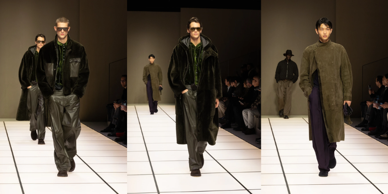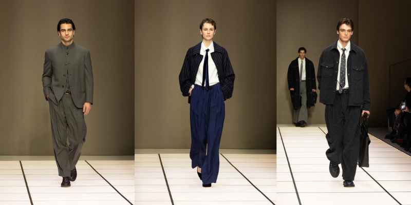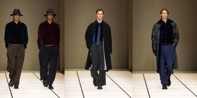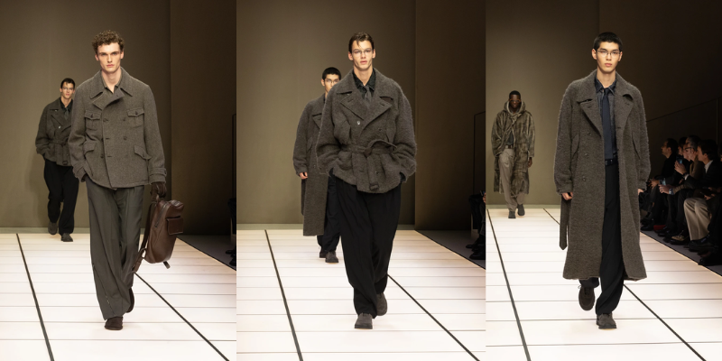 Ngoài ra, bộ sưu tập còn mở ra bằng một chuỗi trang phục may đo mềm, đặt trên bảng màu greige và than chì như một lớp nền ổn định. Áo khoác được cắt cao hơn so với tỷ lệ quen thuộc, phần lớn không xẻ tà sau, nhưng vẫn giữ được độ rủ cần thiết để cơ thể cử động thoải mái. Các mẫu áo khoác dài hai hàng khuy tiếp tục nối dài di sản xử lý chất liệu của nhà mốt, với nhung, da cừu non và bề mặt in họa tiết được khai thác theo hướng nhấn mạnh cảm giác bề mặt hơn là cấu trúc cứng cáp.