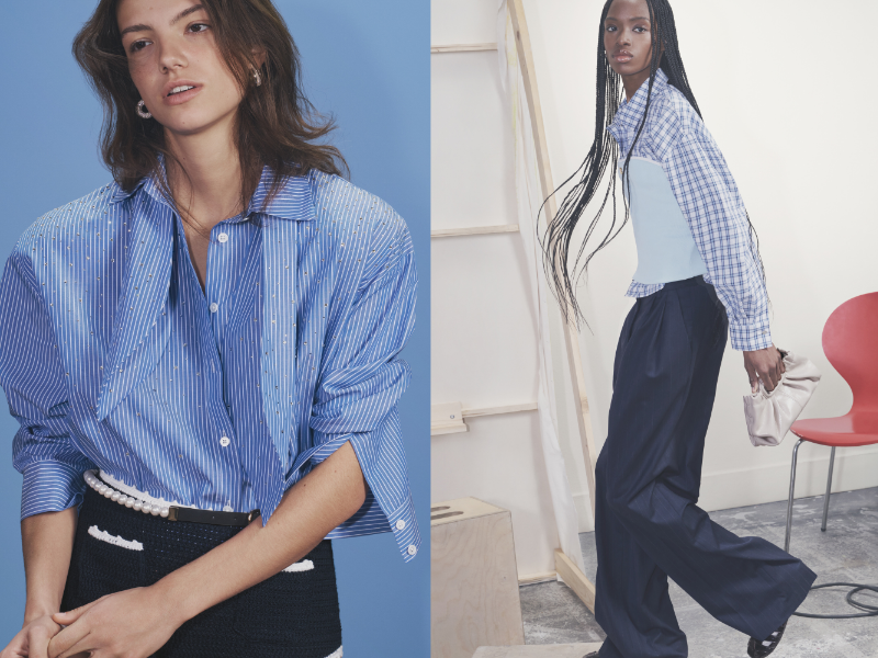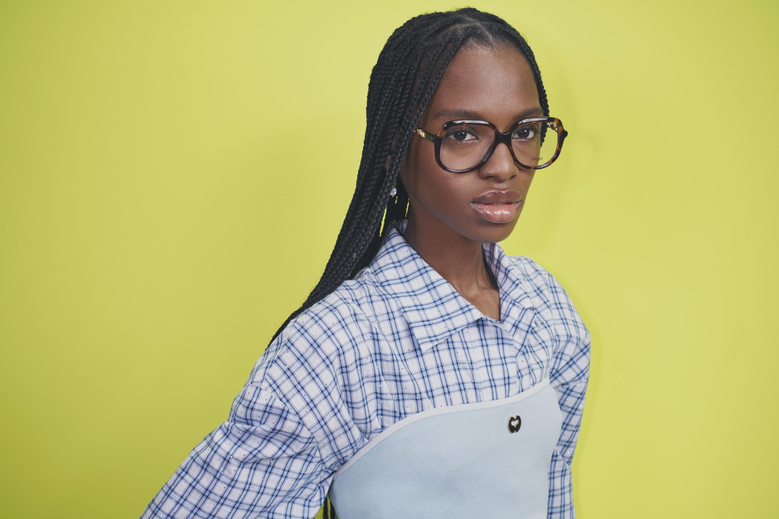Ở một lát cắt khác, tinh thần hiện đại của BST Maje Xuân Hè 2026 tiếp tục được bồi đắp qua các phối cảnh xếp lớp trang phục. Áo sơ mi ca rô kết hợp chi tiết tựa corset xanh pastel đi cùng quần âu xếp ly. Song song đó, sắc đỏ cổ điển của quần tất ôm sát được làm mới khi đặt cạnh chân váy denim viền đá lấp lánh và áo khoác ngắn màu be. Những chiếc kính gọng mắt mèo đen bóng hay gọng đồi mồi khổ lớn khéo léo che bớt biểu cảm, nhấn mạnh phong thái điềm nhiên của quý cô. Ở tuyến trang phục khác, áo sơ mi lụa kẻ sọc đính hạt kim loại li ti bắt sáng tự nhiên trong studio, đi cùng chân váy dệt kim đen và thắt lưng ngọc trai bản lớn, trong khi áo choàng dáng dài kinh điển đặt cạnh đầm khoét lưng xanh lam rực rỡ và áo thắt eo xanh hải quân, nối liền bảng màu phong phú của bộ sưu tập.