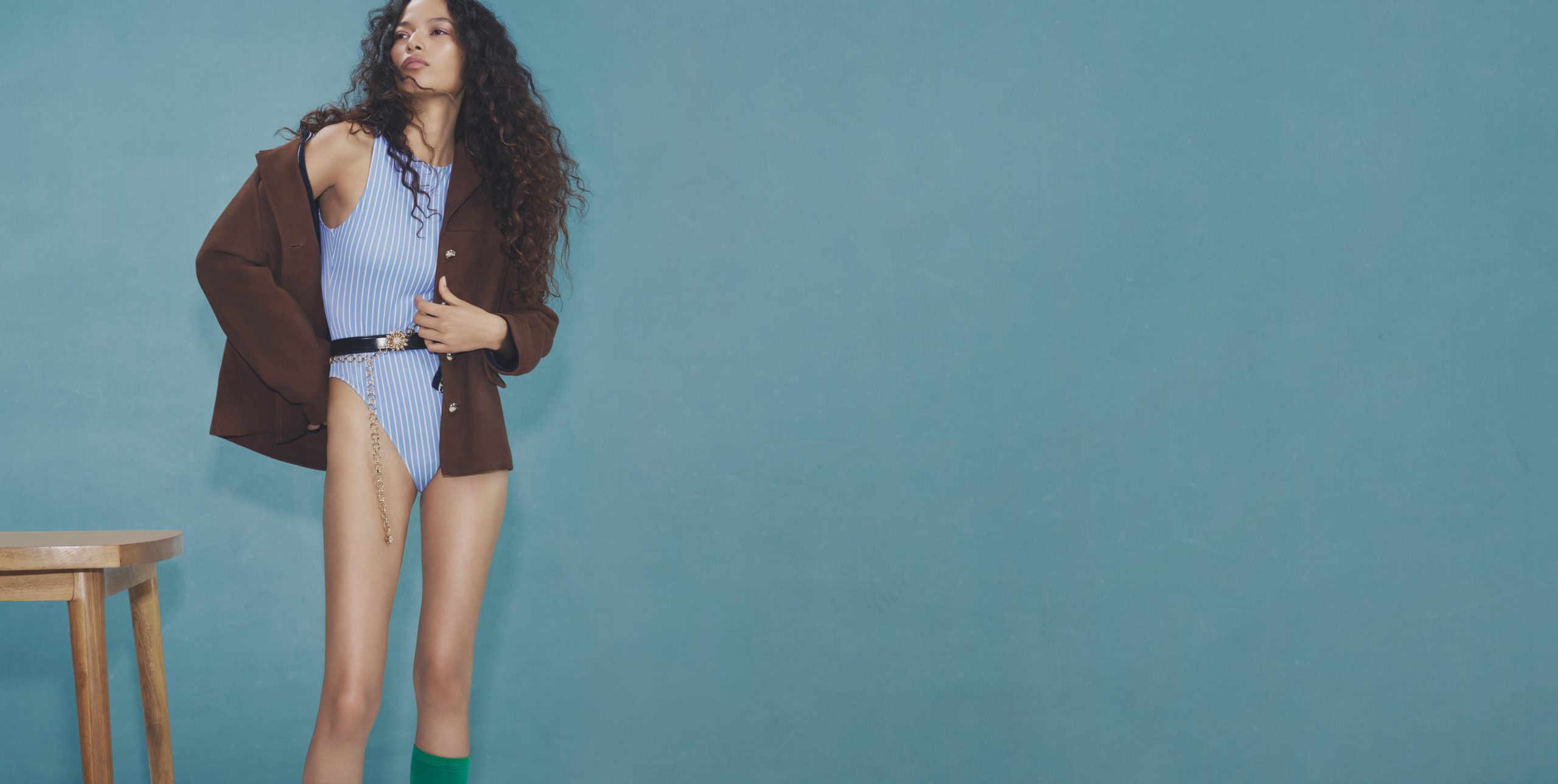 Lấy cảm hứng từ tinh thần hải quân phóng khoáng hòa quyện cùng nét lãng mạn đặc trưng của thời trang Pháp, BST Xuân Hè 2026 của Maje khắc họa tủ đồ dành cho những quý cô tự tin và điềm tĩnh, sẵn sàng dịch chuyển linh hoạt giữa thời trang, nghệ thuật, âm nhạc, đồng thời pha chút táo bạo của đời sống về đêm. Áo liền quần bodysuit kẻ sọc xanh – trắng ôm sát cơ thể tạo thế tương phản rõ nét với phom áo khoác phớt nâu cứng cáp, khoác hờ trên vai đầy ngẫu hứng. Những chi tiết như khóa kim loại, bề mặt da nhăn của túi kẹp nách hay sandal đế bệt quai đan chéo. Trong khi đó, thắt lưng da đính ngọc trai và chuỗi xích mạ vàng tạo điểm neo thị giác nơi vòng eo, cân bằng sắc xanh dịu nhẹ của trang phục, còn chân váy tweed đứng phom lại tiết chế sự mềm rủ của áo sơ mi.