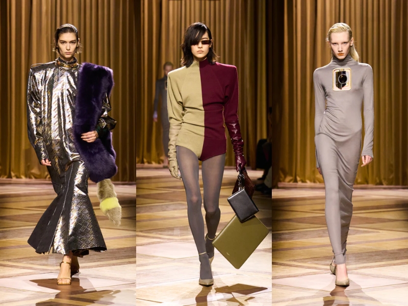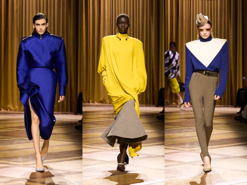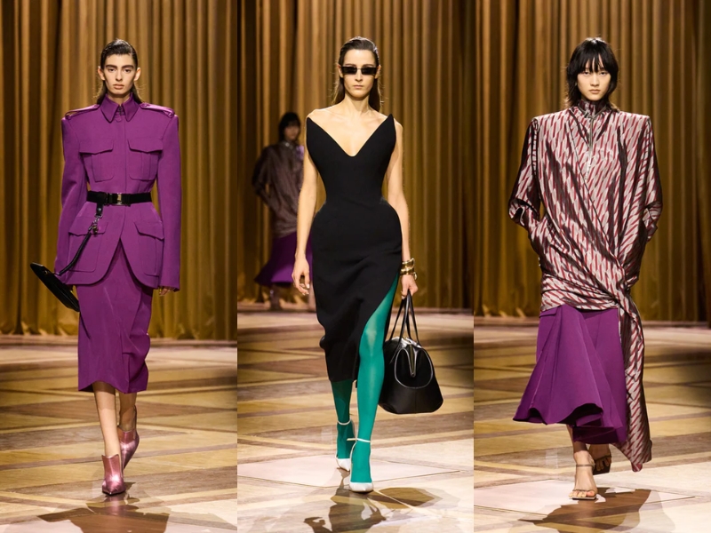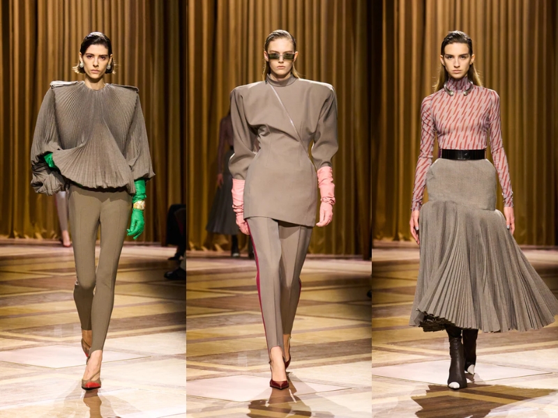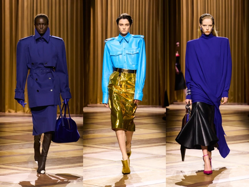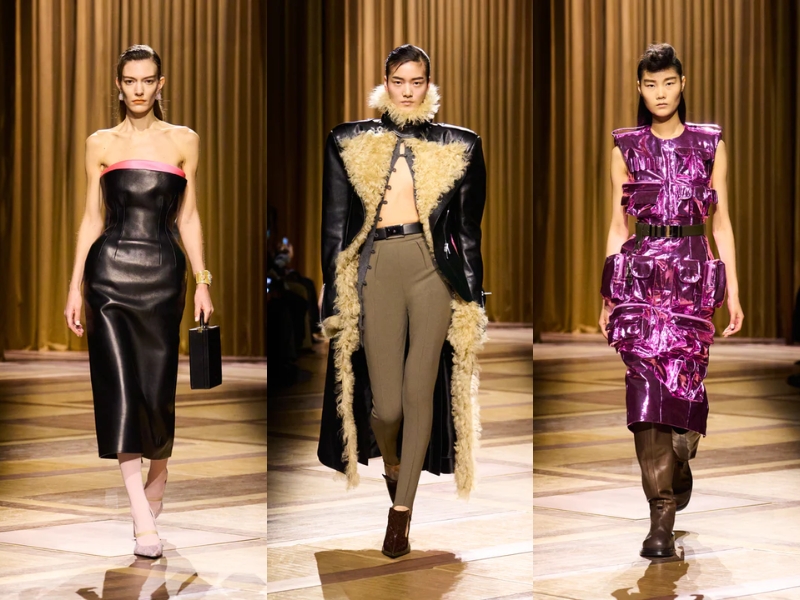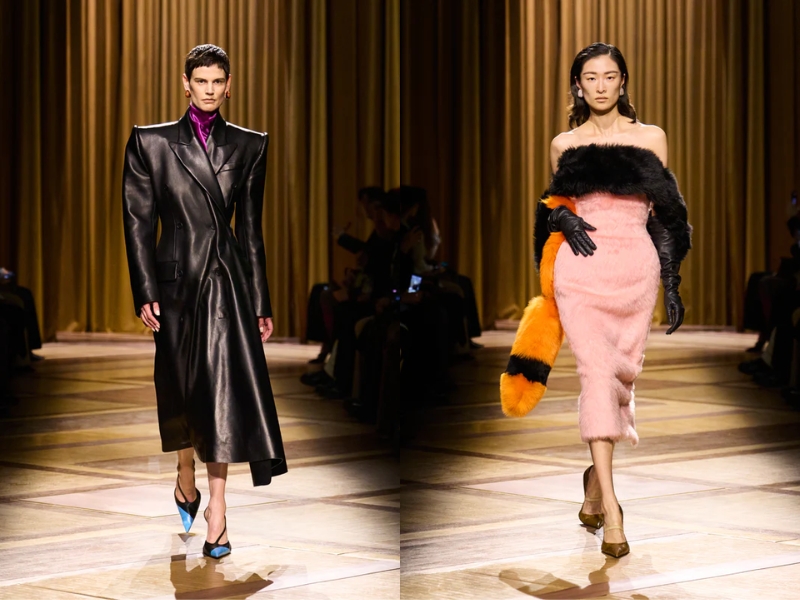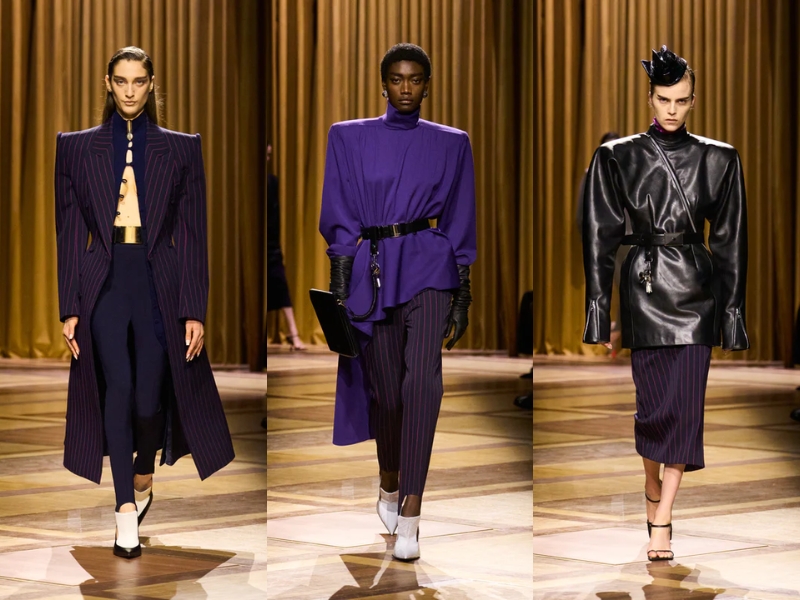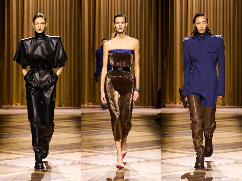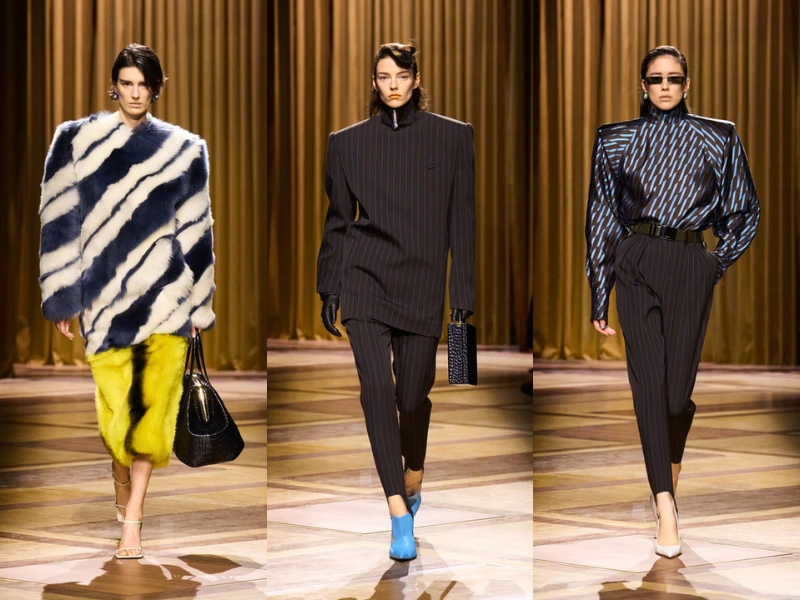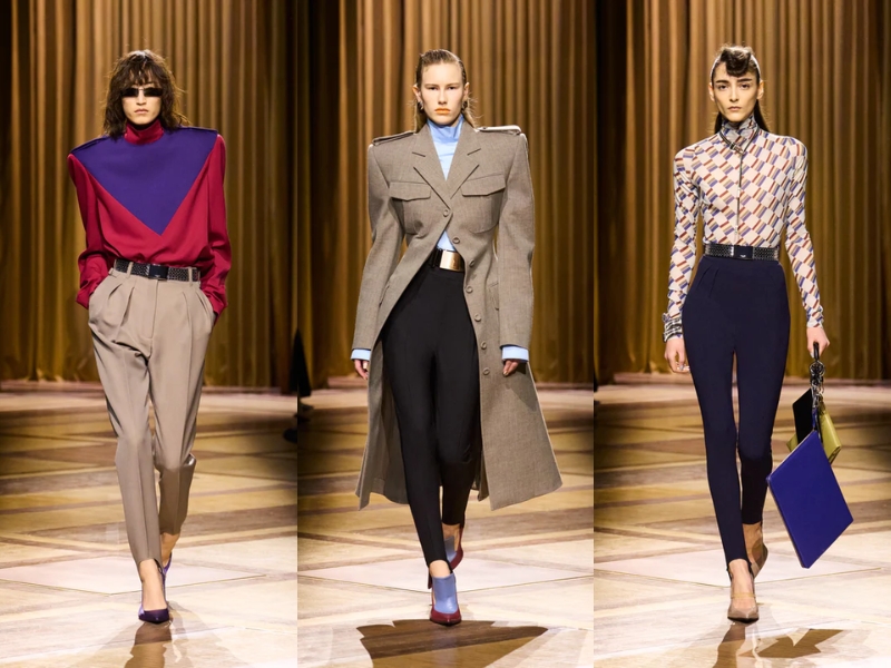 Điểm nhấn quan trọng khác là những chiếc áo khoác có phần vai rộng và cổ áo cao, được may chiết eo hoặc phối với thắt lưng to bản để tạo phom dáng đồng hồ cát cho người mặc. Một chiếc áo khoác da đen cắt may sắc sảo với khóa kéo chéo, kết hợp với chiếc mũ trilby thu nhỏ, gợi nhớ đến vẻ quyến rũ lạnh lùng về đêm gắn liền với Catherine Deneuve trong phim “The Hunger” (1983). Ở một nơi khác, chiếc áo khoác kẻ sọc được may đo tỉ mỉ với đường nét kéo dài của trang phục cung đình thế kỷ XVII, được biến tấu từ những bộ vest quyền lực, đầy tham vọng mà nữ Joan Crawford đã mặc trong phim “Mildred Pierce” (1945) – một kiểu trang phục thể hiện sự leo thang về địa vị xã hội của nhân vật.