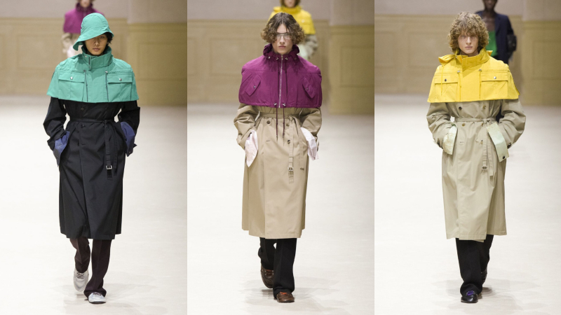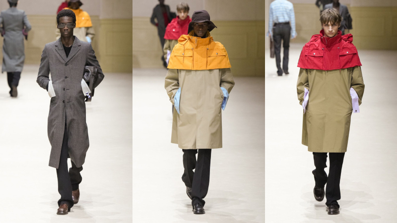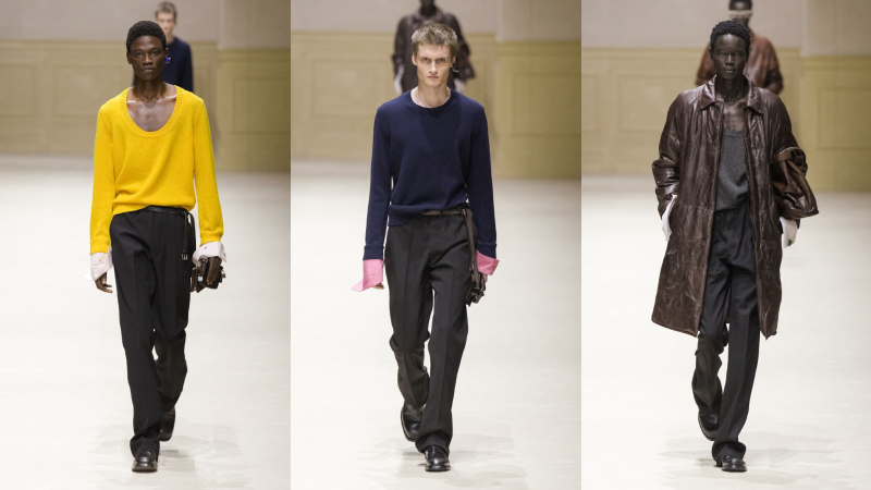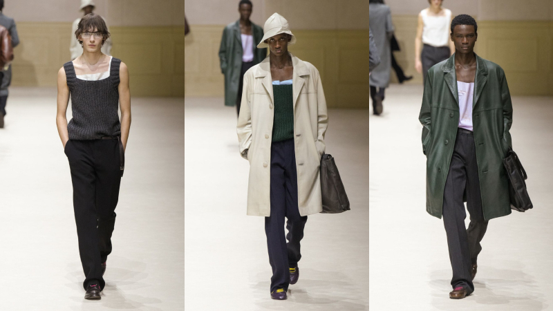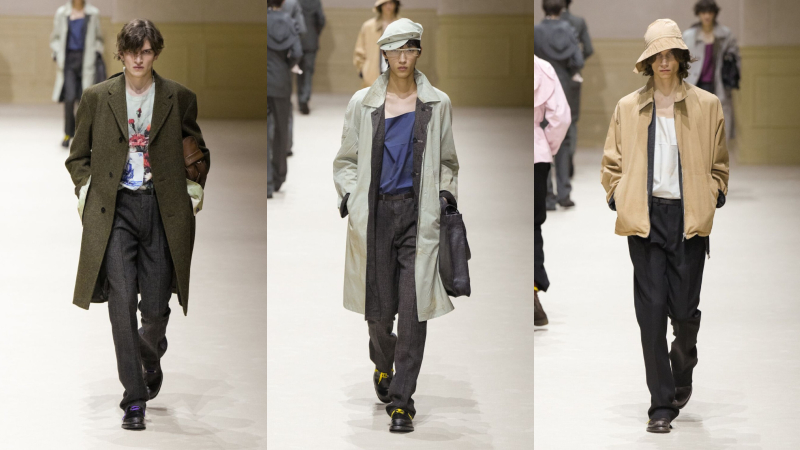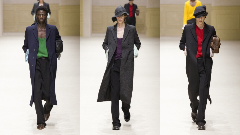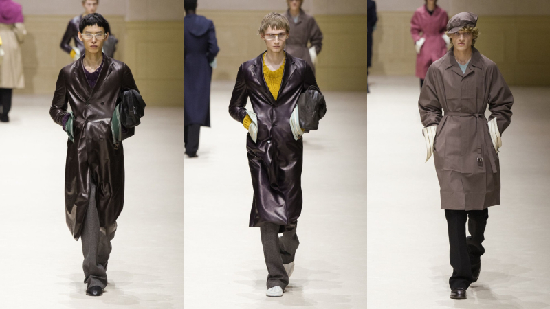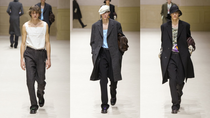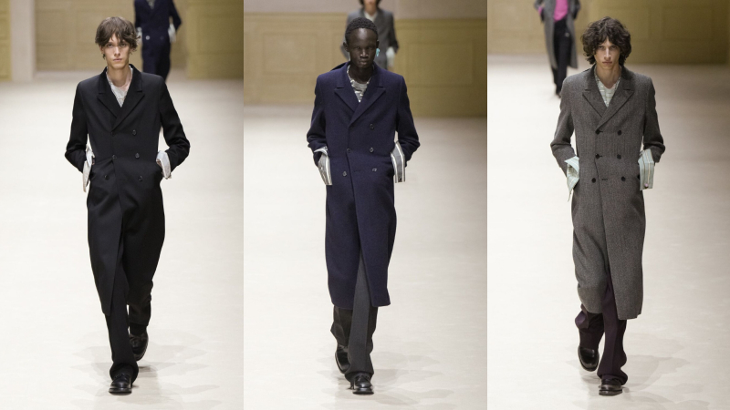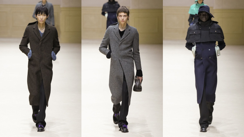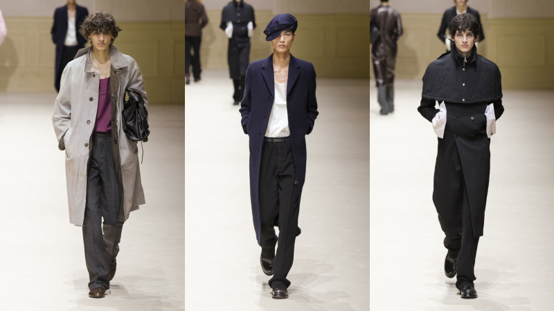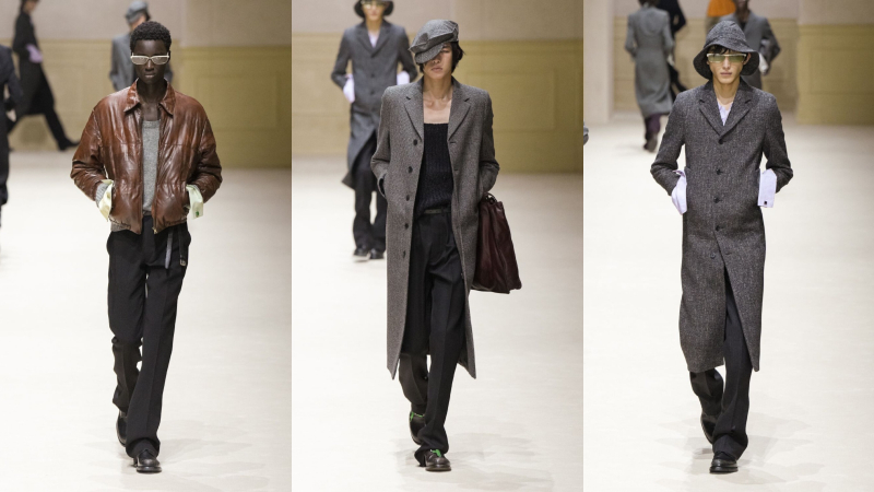 Bộ sưu tập tập trung vào phom dáng thuôn hẹp đến mức tối đa. Những chiếc áo khoác ống cài nút cao, áo cổ đứng tối giản tạo nên đối thoại trực tiếp với các xu hướng phom rộng đang hiện diện tại Tuần lễ Thời trang Milan. Đường nét này thường đi cùng quần len ống loe hoặc áo khoác trench, bên ngoài phủ thêm áo choàng với mảng màu đối lập. Một lớp ngôn ngữ khác nằm ở các khiếm khuyết: cổ tay áo kiểu Pháp mang dấu vết cháy sém, đường may trên áo khoác chống thấm bị mài mòn để lộ lớp tweed ẩn bên trong, hay các thiết kế da chần bông có bề mặt nhăn và dấu hiệu đã qua sử dụng. Những chi tiết này tạo nên xúc cảm về một quá khứ nhiều lớp lang, nơi sự bền bỉ và hao mòn cùng tồn tại.