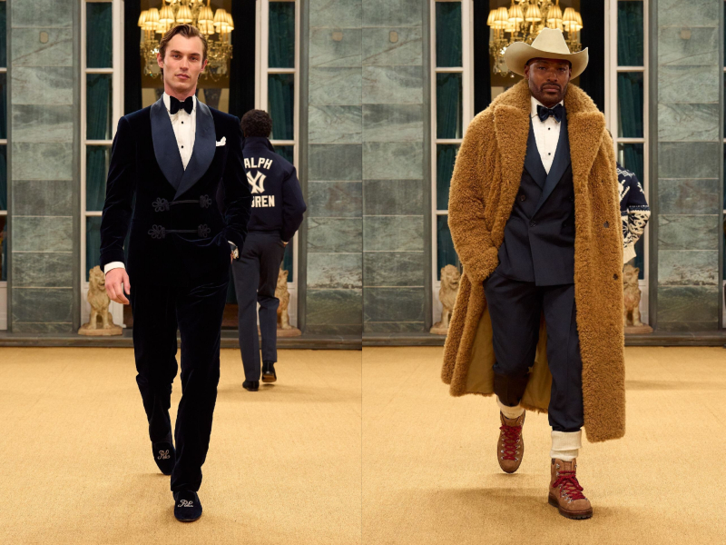 Phần mở màn thuộc về dòng Polo Ralph Lauren, được triển khai với các lớp trang phục đậm sắc. Áo khoác camel được cắt may dứt khoát nhưng nới rộng tỷ lệ, trong khi quần tartan giữ phom gọn, tạo nên đối thoại giữa họa tiết di sản và kỹ thuật may đương đại. Những chiếc áo phao màu cam rực đóng vai trò điểm nhấn thị giác, len lỏi vào bảng màu đất chủ đạo gồm denim bạc màu, tham chiếu quân đội và các chi tiết gợi miền Viễn Tây. Giày bốt leo núi giữ nhịp cho các bộ trang phục kết hợp quần bằng len cashmere với áo khoác may đo, gợi cảm giác thoải mái được tính toán kỹ lưỡng.
