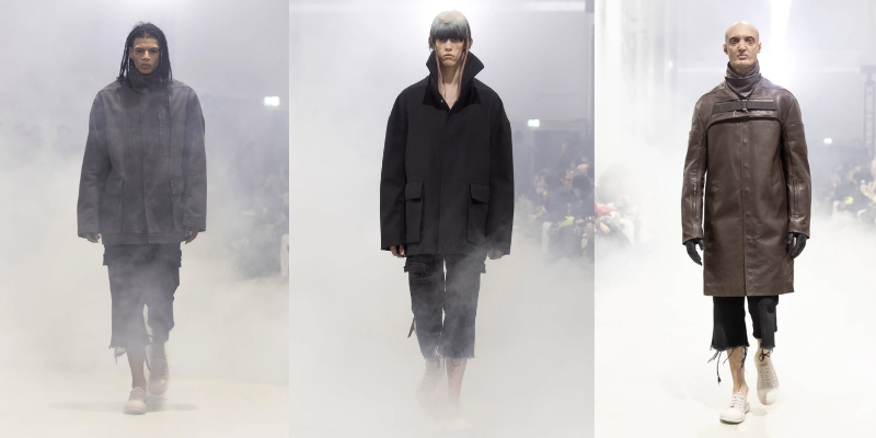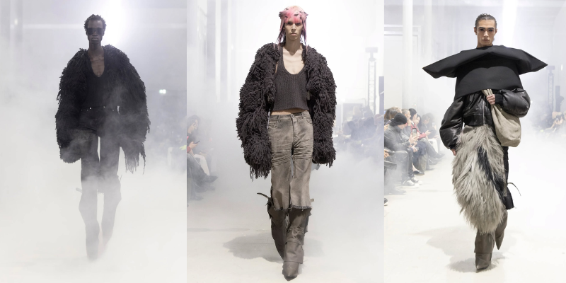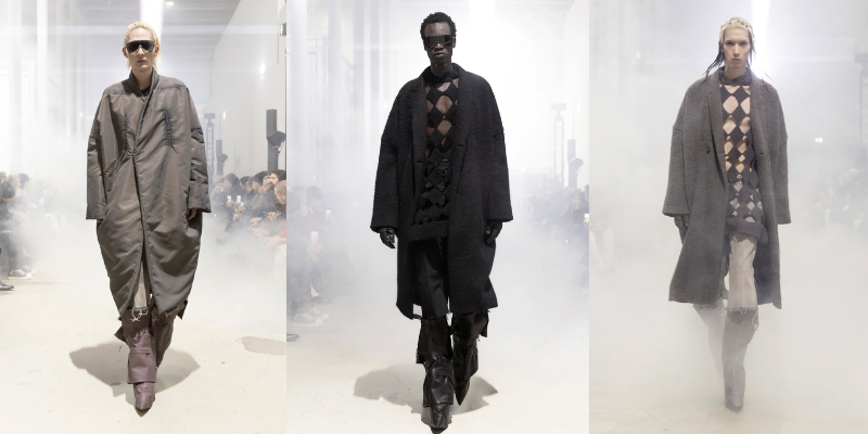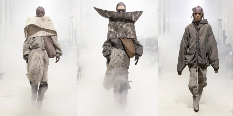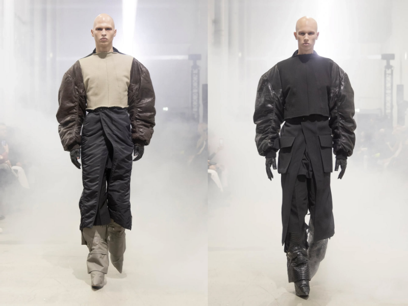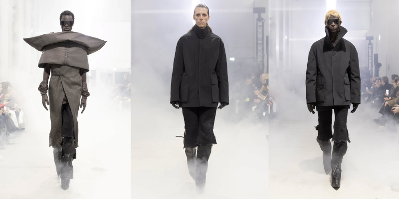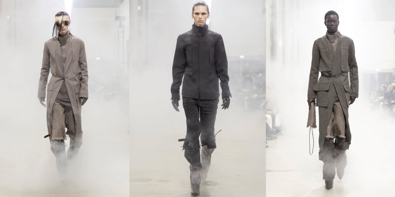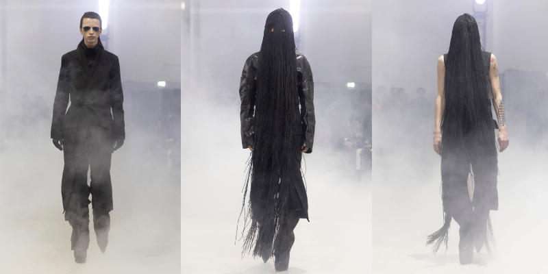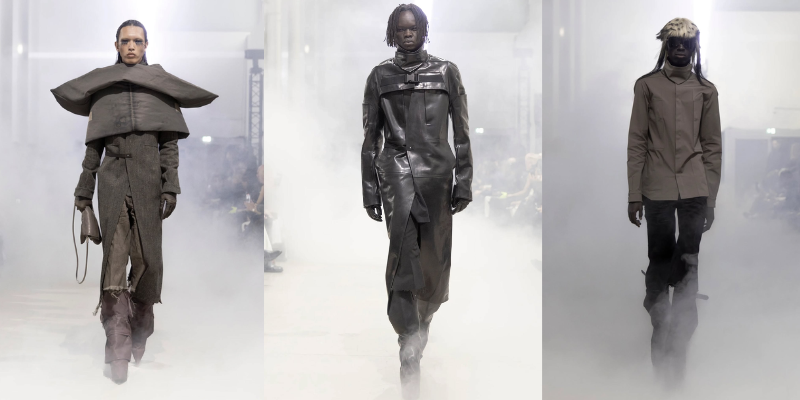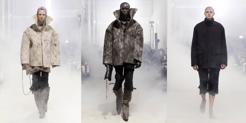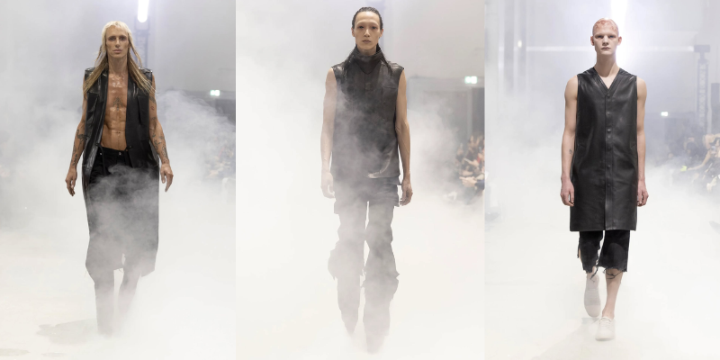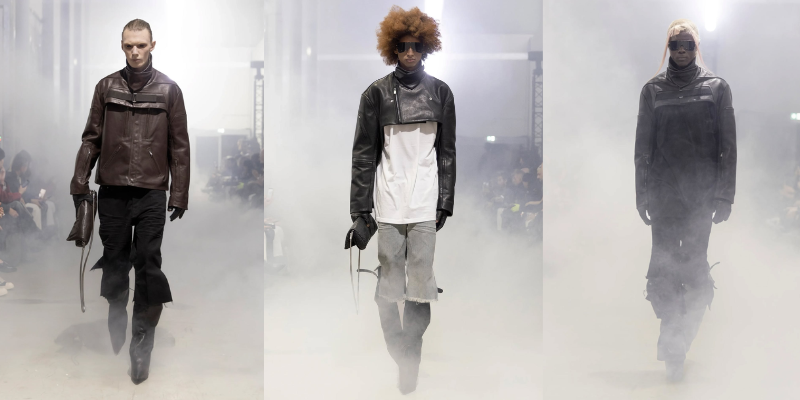 Trong không gian trình diễn khiến khán giả cảm giác như đang bị giam trong một tòa tháp, tiếng nhạc “Ultratronics 11” của Ryoji Ikeada vang lên, dẫn lối tất cả vào thế giới Rick Owens. Làn khói dày đặc bao phủ, tiếng gõ nhịp của những đôi bốt cảnh sát ngoại cỡ, được bóp méo hình khối va đập xuống mặt sàn, phá vỡ cảm nhận về cấu trúc không gian, người mẫu xuất hiện như những hình nhân vô hồn với những chiếc áo biker, áo khoác với chi tiết cầu vai được dứt khoát loại bỏ.
