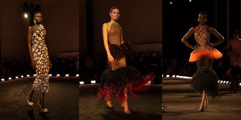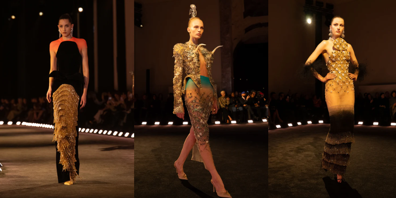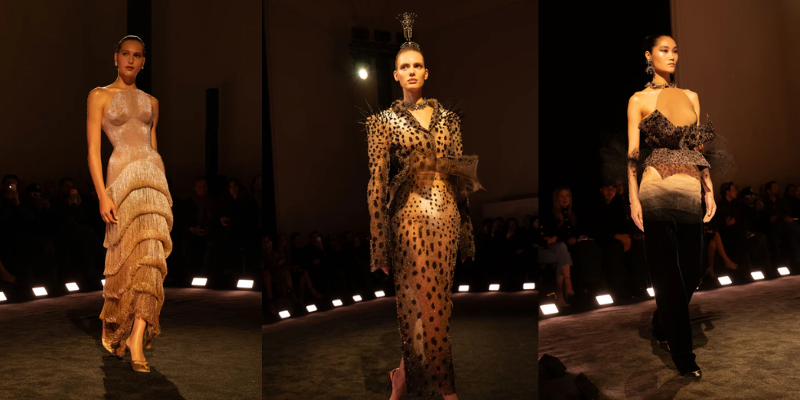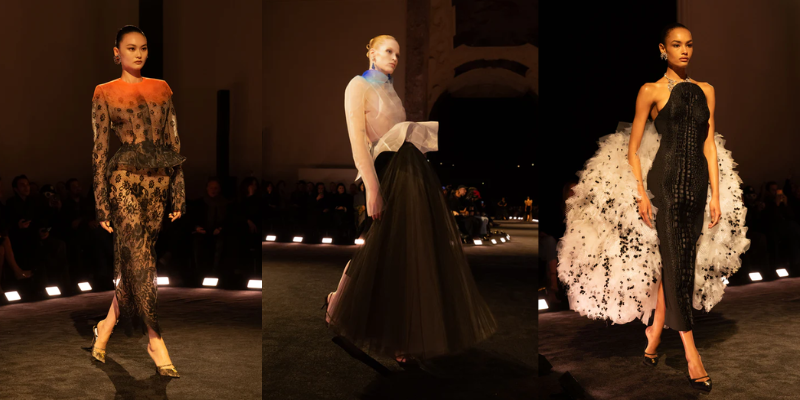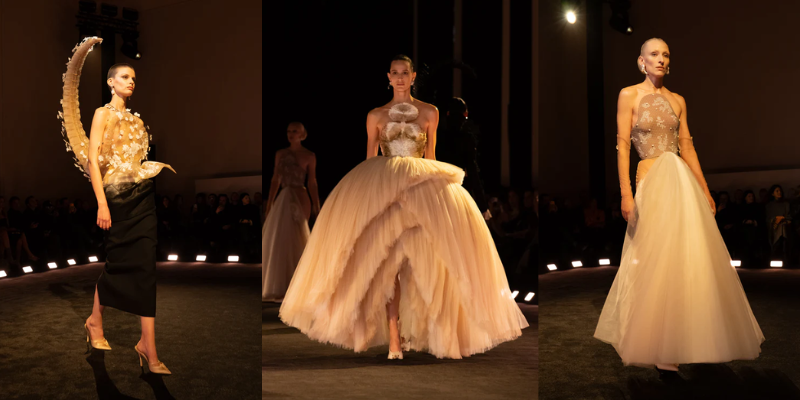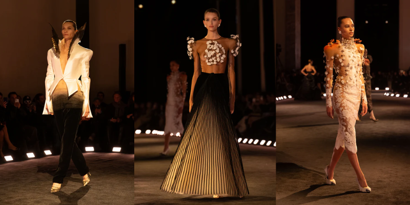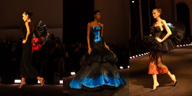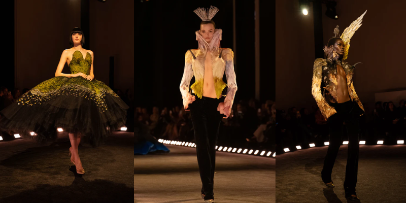 Mở màn cùng chiếc áo khoác da phủ satin trắng với vai sắc như lưỡi dao và hông vươn cao thách thức trọng lực. Từ kiểu dáng cường điệu đó, bộ sưu tập triển khai dần những lớp diễn giải kế tiếp với đuôi bò cạp 3D thêu trong ren chantilly đen, đối thoại cùng bèo ren trắng thủ công tương phản; hay phần vai sắc nét bằng corset vải toile, thêu phủ ren bullion tạo hiệu ứng bò sát, chuyển sắc từ trắng sang xám ngọc trai. Chuỗi tạo tác liên tục mở rộng thông qua chiếc đầm thêu 65.000 chiếc lông vũ màu xanh chim bói cá, hoàn thiện trong khoảng 8.000 giờ; chiếc đầm phủ 690 vỏ sò tự nhiên với chuyển sắc từ nâu chocolate sang xanh xà cừ; cùng các thiết kế với phần áo bustier đính pha lê, tua và lông vũ, hay chiếc đầm đúc khuôn hai lớp, thêu chi tiết mỏ chim theo hiệu ứng đánh lừa thị giác (trompe-l’œil) 3D được điêu khắc thủ công ở phía sau.