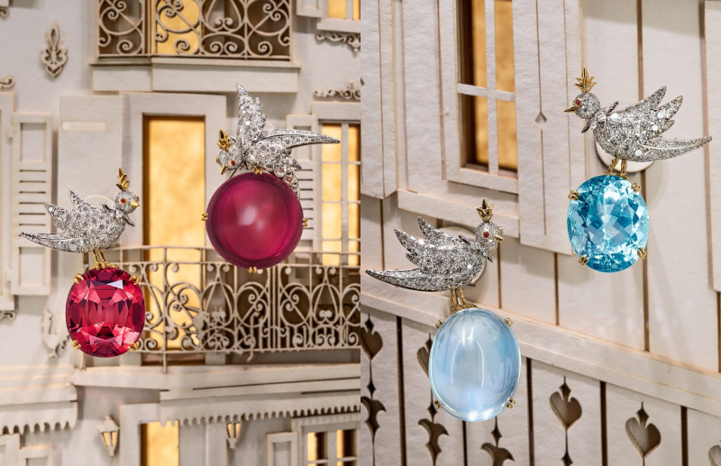Những cặp khác tạo nên mối đối thoại giữa hai loại đá khác nhau, như morganite đi cùng rubellite, opal đen kết hợp topaz cam, hay một tổ hợp hiếm gặp giữa đá mặt trăng xám và tourmaline hồng. Đá mặt trăng xám trong thiết kế này thuộc nhóm đá có độ trong và hiện tượng quang học adularescence rõ nét, được đặt làm trung tâm của trâm cài hình chim. Sự xuất hiện của viên đá này phản ánh định hướng lâu dài của Tiffany & Co. trong việc tìm kiếm và sở hữu những khoáng vật mang tính biểu tượng trong giới đá quý.