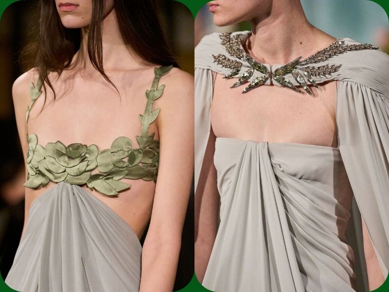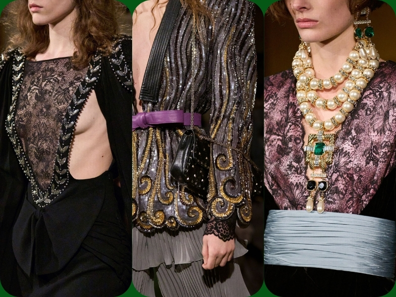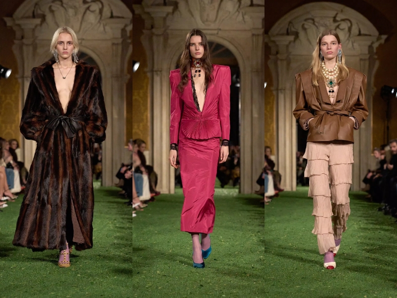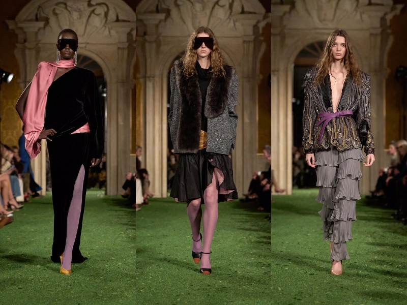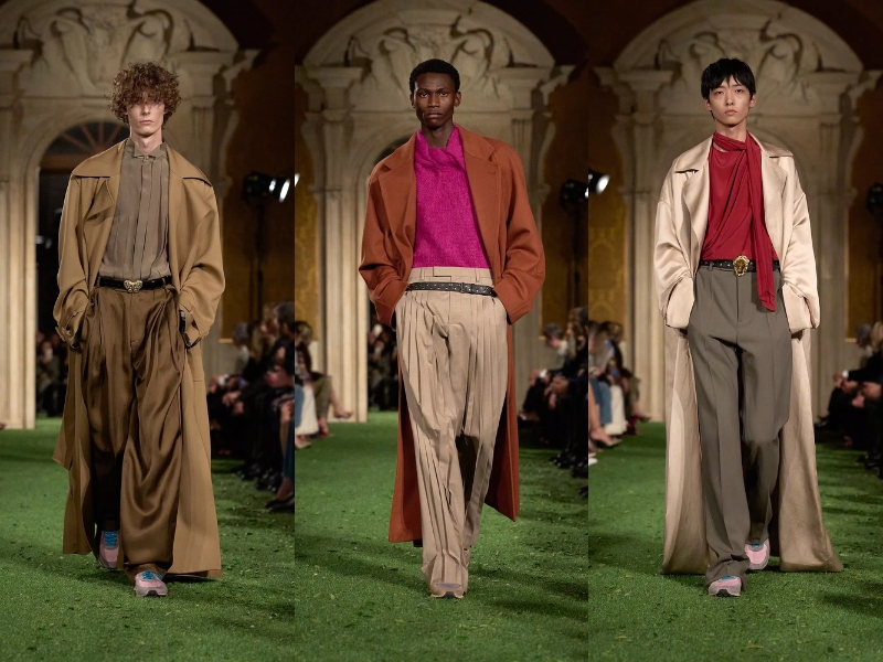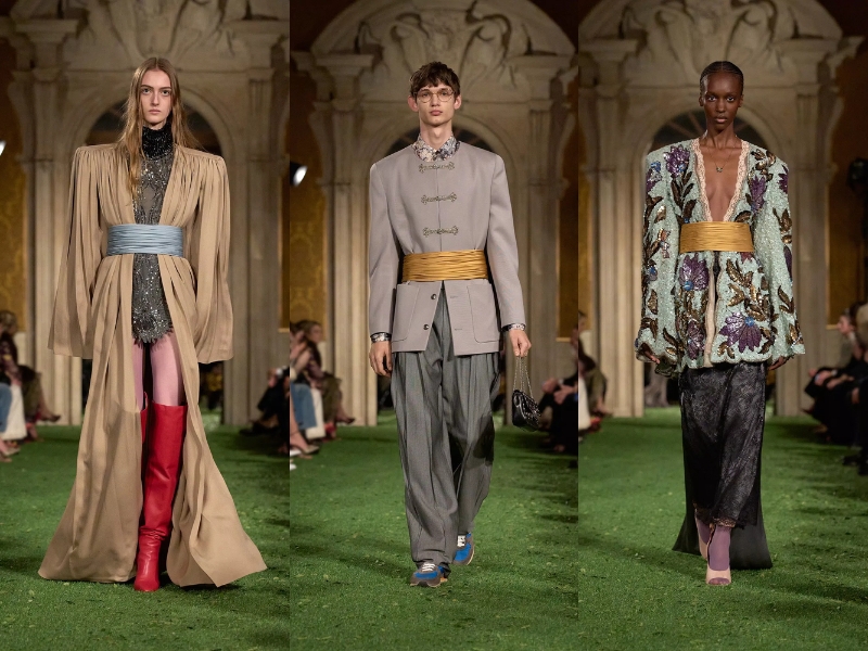 Một trong những lựa chọn tạo kiểu thú vị nhất là chiếc thắt lưng bản rộng. Alessandro đã biến tấu món phụ kiện quen thuộc thành kiểu thắt lưng satin dày, dạn vải quấn, giúp tôn lên vòng eo trong nhiều kiểu trang phục. Thay vì kết hợp với áo sơ mi tuxedo, những chiếc thắt lưng này được phối cùng áo kiểu làm từ vải chiffon mỏng nhẹ, đầm ngắn thướt tha và những bộ trang phục mềm mại, có độ rủ. Bộ sưu tập ngập tràn những gam màu đậm, rực rỡ: hồng tím đậm, vàng mù tạt, xanh ngọc bích, màu mận nhung và những điểm nhấn màu đỏ rực lửa. Trên lý thuyết, bảng màu có vẻ hỗn loạn, nhưng trên sàn diễn, nó lại mang đến cảm giác hài hòa kỳ lạ, mỗi sắc thái được xếp lớp lên nhau một cách hoàn hảo.