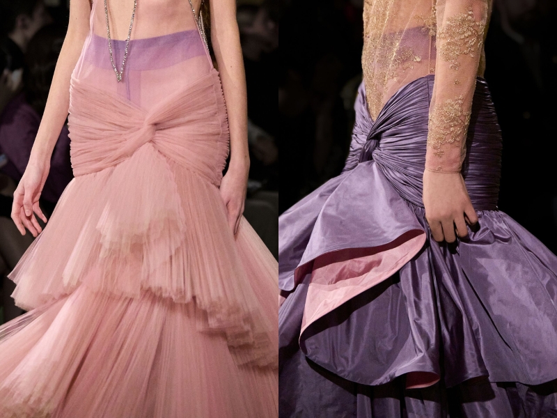 Tính bất đối xứng đóng vai trò là “khung xương” xuyên suốt bộ sưu tập. Một số thiết kế có cấu trúc không cân đối, với các chi tiết xếp nếp dịch chuyển trên cơ thể để tạo ra sự chuyển động và cảm giác căng thẳng. Một trong những sự tái hiện đương đại rõ nét nhất là mẫu đầm nhung dài chấm đất màu đen và hồng, được thiết kế lệch vai. Kiểu dáng ấn tượng nhưng tinh tế của nó cho thấy nhà thiết kế đã chắt lọc những tư liệu lưu trữ thông qua một góc nhìn hiện đại hơn. Sự tương phản màu sắc mạnh mẽ và chất liệu nhung mềm mại càng làm tăng thêm chiều sâu cho bộ trang phục.