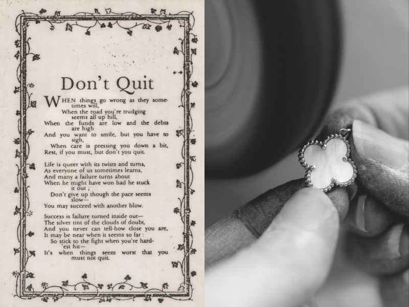 Người ta kể rằng, Jacques Arpels, cháu của Estelle Arpels, thường nhặt những chiếc cỏ bốn lá trong vườn, tặng cho nhân viên kèm bài thơ “Don’t Quit”. Trong mỗi món trang sức Alhambra, dường như vẫn còn phảng phất tinh thần ấy: Hãy tin vào vận may, ngay cả khi nó chưa mỉm cười với mình.