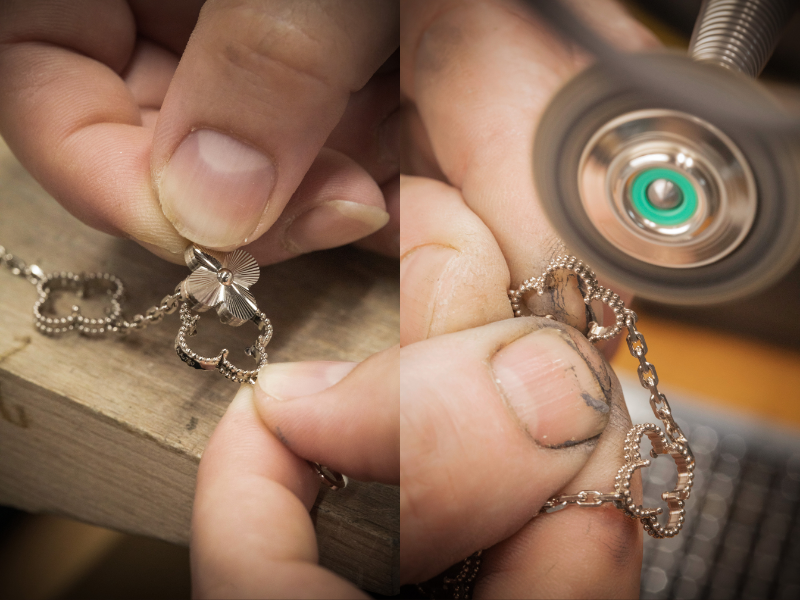 Qua nửa thế kỷ, Alhambra vẫn không ngừng biến hóa. Những xà cừ xám, đá onyx, đá lapis lazuli, thạch anh trắng trong suốt hay kim cương lấp lánh, tất cả được gói ghém trong khung vàng trắng, vàng hồng, vàng vàng. Mỗi sắc độ là một tâm trạng; mỗi đường viền hạt nhỏ là nhịp thở của người thợ kim hoàn. Bên dưới lớp ánh sáng là cả 15 công đoạn thủ công, nơi bàn tay “Mains d’Or” (những đôi tay vàng) cắt, mài, đánh bóng từng chi tiết như thể đang nắn hình cho điều may mắn hữu hình.