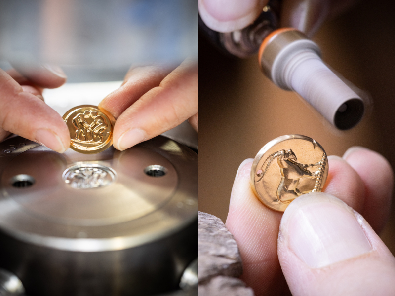 Hai mặt của huy chương lần lượt khắc họa hình tượng của 12 cung Hoàng đạo, cùng với biểu tượng và ngày tháng bằng số La Mã, tạo nên sự hòa quyện tinh tế giữa độ nổi và chất liệu bề mặt. Cung Xử Nữ được thể hiện duyên dáng qua hình ảnh một thiếu nữ bên chú kỳ lân; cung Bạch Dương nổi bật với bộ lông xoăn và dáng đứng mạnh mẽ; còn tư thế uy nghi của Sư Tử gợi nhắc đến phong cách biểu tượng học cổ đại.