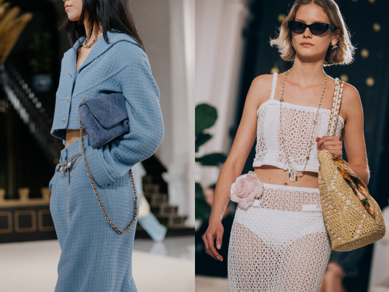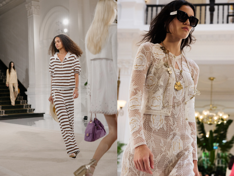 Khi những người mẫu bước ra trên sàn diễn, vũ trụ CHANEL Cruise một lần nữa mở ra với vẻ đẹp vừa phóng khoáng vừa tinh tế. Bộ suit và pyjama buổi tối được xử lý trên nền tweed mềm, lurex ánh vàng hay sequin thêu tay toàn bộ, mang đến cảm giác chuyển động nhẹ như hơi thở. Tiếp nối là những dáng váy lamé kẻ hồng cam, đầm dạ hội taffeta ngắn phủ tầng xếp bèo pastel, phối cùng găng tay dài gợi nhớ tinh thần tiệc tối cổ điển. Bảng màu tươi sáng cùng họa tiết hoa bung nở trên ren và hoa văn in, trong khi những mã DNA đặc trưng của dòng Cruise như quần trắng phom thẳng, áo pea coat, kẻ sọc định hình một phong thái thanh thoát và tự nhiên. Hoàn thiện tổng thể là khăn lụa satin buộc hờ trên tóc, cổ tay hoặc mắt cá, tạo nên nhịp điệu mềm mại cho mỗi bước chuyển.
