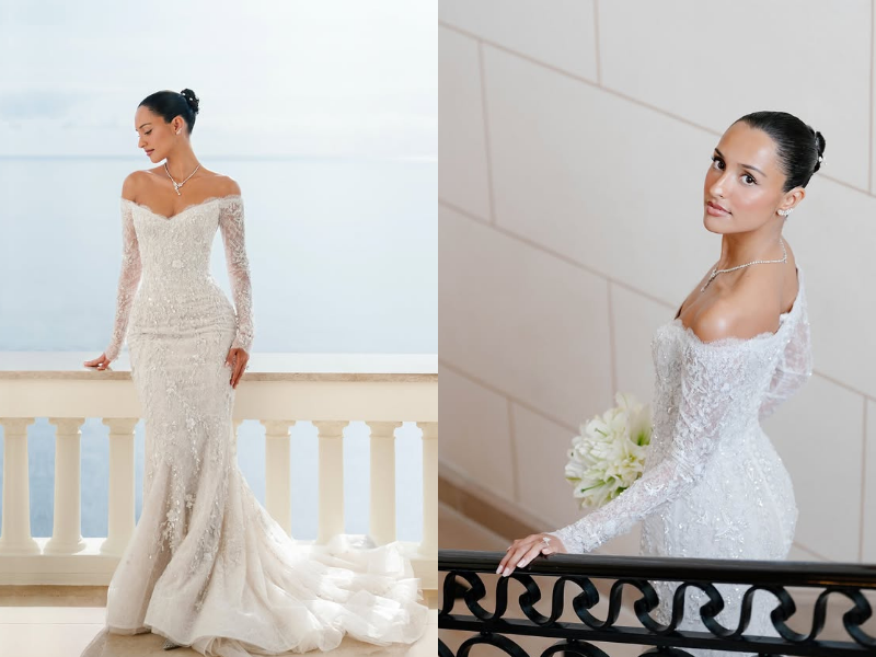 “Hoàng tử tóc xoăn” Charles lịch lãm trong bộ âu phục màu kem nhạt được may đo thủ công bởi nhà mốt Brunello Cucinelli, tay đeo đồng hồ Richard Mille RM 72-01 phiên bản titanium. Trong khi đó, cô dâu Alexandra Saint Mleux yêu kiều tựa các phu nhân hoàng gia thế kỷ trước khi khoác lên chiếc đầm từ thương hiệu Paolo Sebastian. Chiếc đầm nổi bật với chất liệu ren Chantilly Pháp cao cấp, điểm xuyết những chi tiết thêu tay mang tính di sản, lồng ghép khéo léo chữ cái đầu của cả hai cùng ngày cưới 28/02. Điểm xuyết cho diện mạo của nàng mẫu là bộ trang sức kim cương từ Graff, với chiếc nhẫn đính hôn có giá trị ước tính hơn 500.000 đô la Mỹ.