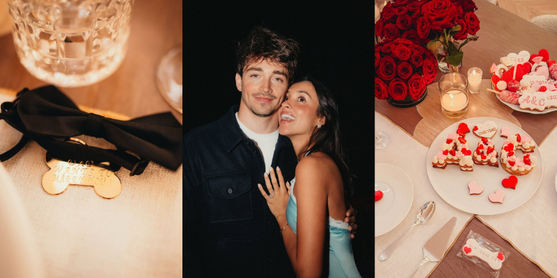 Trên Instagram, Charles không giấu được niềm hạnh phúc khi đăng loạt hình ảnh lãng mạn cùng nửa kia kèm dòng trạng thái: “Mr and Mrs Leclerc” (tạm dịch: Ông và Bà Leclerc). Có thể nói, cách tay đua của đội Ferrari chuẩn bị kỳ công cho màn cầu hôn bà xã khiến bất kỳ ai cũng phải xuyến xao. Charles đeo cho chú chó cưng Leo một thẻ tên khắc dòng chữ: “Ba muốn cưới mẹ!”, sắp xếp những chiếc bánh quy có dòng chữ “Chúng tôi sắp kết hôn” và ký hiệu “A&C” từ chữ cái đầu tên của cả hai. Đặc biệt, chiếc nhẫn đính hôn trên tay Alexandra khi đó được chuyên gia trang sức Laura Taylor của Lorel Diamonds định giá ít nhất 530.000 đô la Mỹ, ước tính hơn 13 tỷ đồng bởi viên kim cương cắt oval 5-6 carat gắn trên đai bạch kim.