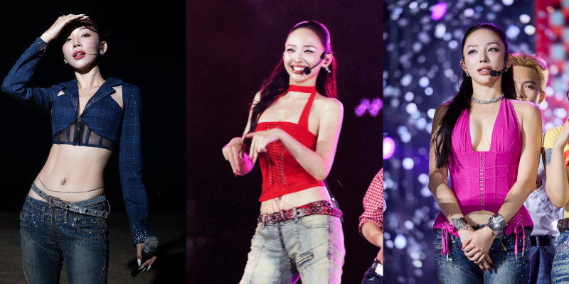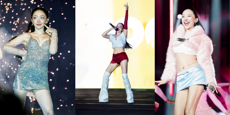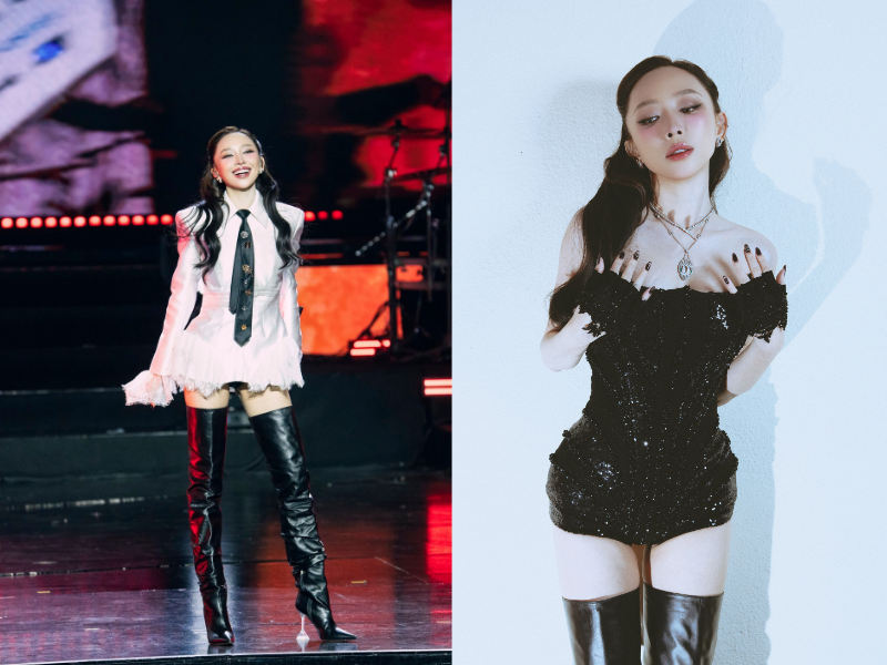 Bên cạnh âm nhạc và phong cách trình diễn, “Rock Thiệp Hồng” thu hút sự chú ý khi Tóc Tiên mang đến hai sắc thái đối lập trên sân khấu. Nữ ca sĩ mở màn với blazer trắng chiết eo, phối cà vạt đen, chân váy ngắn layer ren và boots da cao quá gối, trước khi chuyển sang một bộ suit đen mang tinh thần gợi cảm hơn. Nhìn lại tủ đồ sân khấu của giọng ca “Ngày Mai”, có thể thấy các thiết kế ôm dáng, nhấn eo từ lâu đã trở thành lựa chọn quen thuộc của cô, từ corset hiện đại kết hợp jeans đến crop-top đi cùng chân váy ngắn.