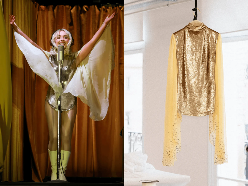 Khi sân khấu chuyển mình sang chương lấy cảm hứng từ phong cách Studio 54 và văn hóa disco, Sabrina xuất hiện rạng rỡ trên biểu tượng “Sabrinawood” khổng lồ. Thiết kế thứ hai là một chiếc đầm mini cổ cao kết kín sequins vàng kim, mang lại cảm giác của một ngôi sao màn bạc thời kỳ thập niên 70. Điểm đắt giá nhất của thiết kế này chính là sự tương phản chất liệu đầy thú vị, thân đầm được đính kết sequins cứng cáp, tạo phom đứng dáng, đối lập hoàn toàn với phần tay áo bằng voan lụa màu champagne bồng bềnh. Những lớp voan lụa mỏng manh không chỉ mang âm hưởng tự do của trào lưu Boho-chic mà còn khiến mỗi cử động tay của Sabrina khi biểu diễn ca khúc “Juice” trở nên thoát tục, lãng mạn. Để hoàn thiện vẻ ngoài, cô chọn đôi bốt cao cổ Lucie 75 từ Stuart Weitzman bằng da màu kem, tạo nên sự cân bằng hoàn hảo giữa nét cổ điển và sự trẻ trung hiện đại.