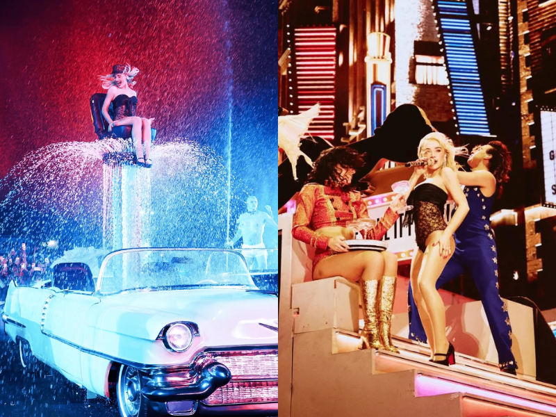 Mở màn buổi diễn giữa không gian sa mạc Indio, Sabrina xuất hiện đầy kiêu kỳ trên đỉnh sân khấu được thiết kế như một ngôi nhà Hollywood cổ điển. Tạo hình đầu tiên là sự kết hợp giữa vẻ ngoài kín đáo và sự bùng nổ ngầm bên trong. Cô khoác lên mình chiếc áo khoác gabardine màu đỏ phối cổ da đen đầy vẻ uy quyền, trước khi rũ bỏ nó để lộ diện thiết kế đầm mini màu đỏ ruby rực rỡ bên dưới.