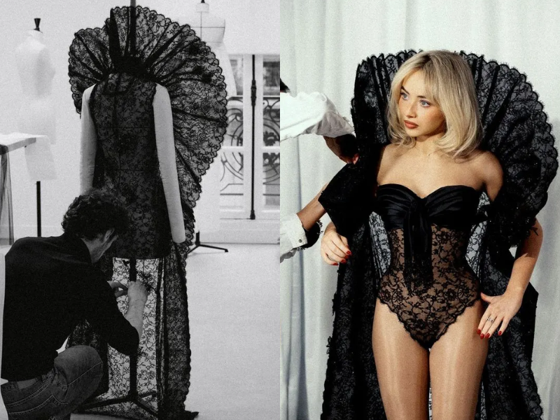 Điểm nhấn mang tính Avant-garde và chiếm trọn tâm điểm chính là chiếc áo choàng bằng ren đen thêu đá quý cùng pha lê. Thay vì rủ mềm như những kiểu áo choàng thông thường, phần ren được xử lý bằng kỹ thuật đặc biệt để tạo phom dáng điêu khắc vững chãi như những đôi cánh vươn rộng phía sau lưng. Hình ảnh Sabrina trong bộ ren đen, đội chiếc mũ newsboy đồng điệu và sải bước trên đại lộ “Walk of Fame” ảo ảnh dưới cơn mưa giả định đã tạo nên một khoảnh khắc thời trang lịch sử tại Coachella. Chi tiết áo choàng này không chỉ là phụ kiện, nó là một thực thể nghệ thuật tách biệt, biến Sabrina thành một nữ thần bóng đêm đầy quyền năng và đầy kiêu hãnh.