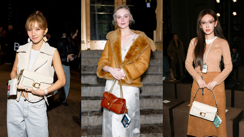 Không dừng lại ở đó, các thương hiệu khác cũng không đứng ngoài cuộc chơi đầy tính trí tuệ này với những chất liệu văn chương kinh điển. Trong khi Miu Miu, Celine và Loewe tiếp tục khai thác hình ảnh những nữ sinh khoa văn chương đầy lôi cuốn với những chiếc váy mini và kính cận gọng dày, thì show diễn Coach Thu Đông 2026 ghi nhận sự xuất hiện của những gương mặt đại diện như Trình Tiêu, Soyeon ((G)I-DLE) và Elle Fanning trong những bộ đồ mang đậm hơi thở Literary Chic. Điểm nhấn đắt giá nhất trên hàng ghế đầu chính là những chiếc túi Tabby được tô điểm bởi các món phụ kiện móc khóa hình cuốn sách bằng da thu nhỏ đầy tinh xảo, vốn là những tác phẩm có thể mở ra và đọc được, tạo nên một sự kết nối thú vị giữa vật dụng đời thường và kho tàng tri thức.
