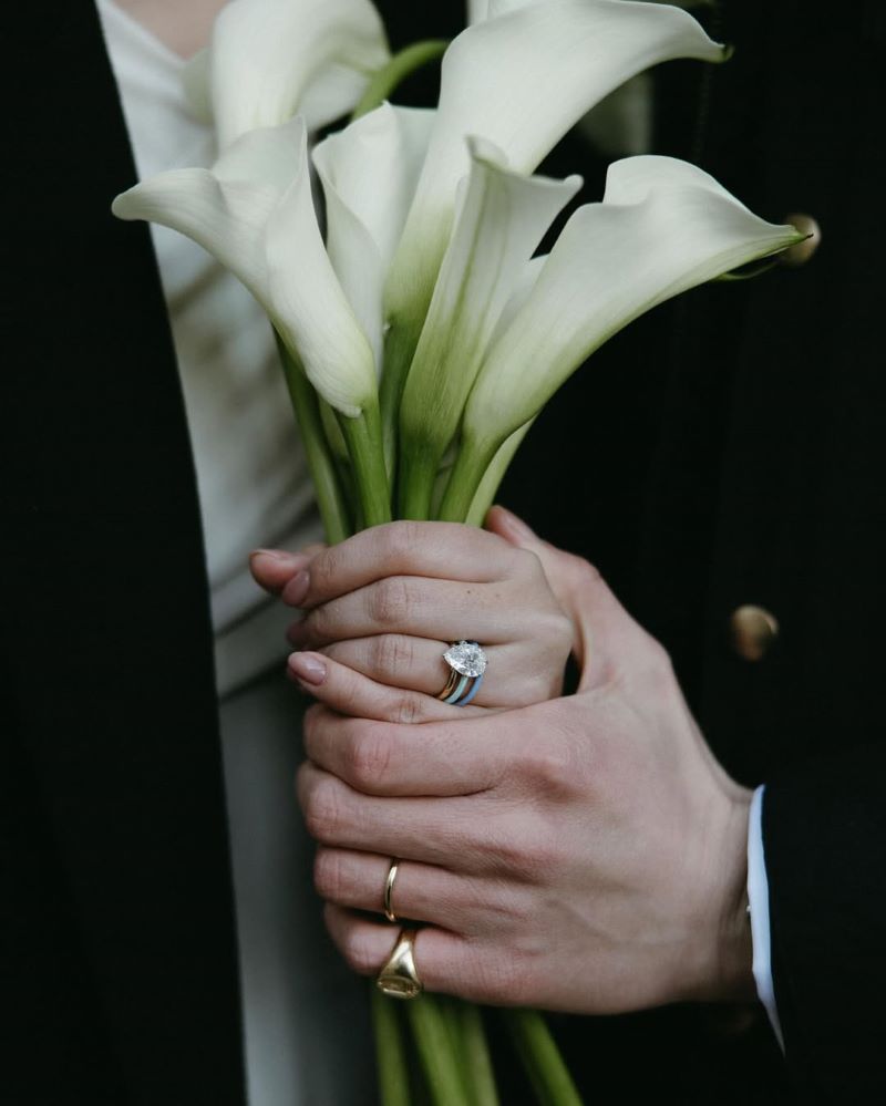 Chiếc nhẫn lấp lánh Sean trao cho Jung Da Hye không chỉ kết nối hai trái tim, mà còn nối dài câu chuyện của một di sản. Cả nhẫn đính hôn và nhẫn cưới đều đến từ Taffin, thương hiệu trang sức thủ công do James de Givenchy (chú của Sean) sáng lập. Trên nền gốm xanh lam nhạt, viên kim cương hình quả lê tỏa sáng tinh xảo và thanh thuần, phản chiếu gu thẩm mỹ tinh tế của đôi uyên ương. Da Hye nói rằng: “Chiếc nhẫn đầu tiên Sean tặng tôi cũng là một Taffin gốm xanh, vì vậy sắc màu ấy trở thành sợi dây kết nối đặc biệt giữa chúng tôi”.