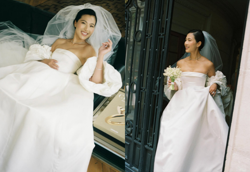 Cô dâu Jung Da Hye xuất hiện rạng rỡ trong chiếc đầm lụa may đo riêng, kết hợp áo choàng tay bồng đầy kiêu kỳ. Chiếc đầm vừa mang nét cổ điển vượt thời gian, vừa nổi bật nhờ mạng che mặt dài kiểu nhà thờ và áo choàng taffeta, tạo nên một thiết kế độc bản cho cô dâu. Đây là tác phẩm của Andrew Kwon, nhà thiết kế người Mỹ gốc Hàn mà Jung Da Hye chọn sau khi tham khảo hơn 10 tiệm đồ cưới tại Manhattan. Trong suốt 18 tháng để hoàn thiện thiết kế, đội ngũ của Kwon đã thử hàng chục tấm taffeta trắng để tìm ra sắc độ hoàn hảo, đồng thời dành hàng giờ chăm chút cho kết cấu và từng đường may.