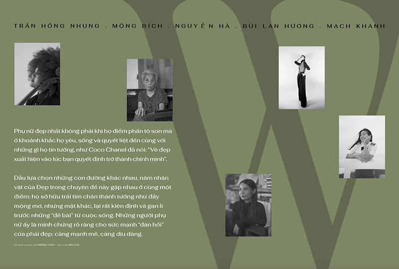 Chuyên đề Inspiring Women ở số 269 như một khúc tụng ca dành cho năm người phụ nữ tự chủ trong đam mê và sự lựa chọn: ca sĩ Bùi Lan Hương phiêu du trong âm nhạc, họa sĩ Mộng Bích lặng lẽ cặm cụi với sắc màu, kiến trúc sư Nguyễn Hà dựng nên những không gian, phi công Mạch Khanh chinh phục bầu trời, nghệ sĩ cello Trần Hồng Nhung thả hồn trong tiếng nhạc. Nếu Coco Chanel từng nói “Vẻ đẹp xuất hiện vào lúc bạn quyết định trở thành chính mình”, thì Đẹp đã chứng minh điều đó bằng chính sự kiên định của những người phụ nữ ấy.