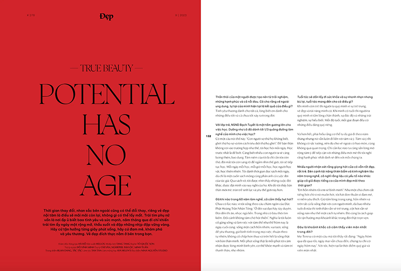 Cũng trên hành trình ấy, Đẹp đã gợi mở một chân lý giản dị mà sâu sắc: cái đẹp không tuổi, và sự tự chủ không có hạn dùng. Chuyên đề Tâm hồn không tuổi ở số 290 đưa người đọc gặp đạo diễn – nhà văn Xuân Phượng ở tuổi 95, vẫn trang nhã, thông tuệ và cháy bỏng như một thiếu nữ, hay nghệ sĩ Ái Như ở tuổi ngoài 60 vẫn run rẩy theo nhịp đèn sân khấu. Trước đó, bộ ảnh Potential has no age trong số 278 đã từng khơi mào cho tinh thần đó: từ người mẫu cao tuổi Minh Đăng Khánh, ca sĩ Lynk Lee, đến NSND Bạch Tuyết, tất cả cùng khẳng định rằng thời gian có thể làm đổi thay dung mạo, nhưng trái tim và ý chí thì không. Với Gen Z, vốn đang sống trong xã hội gắn liền với tuổi trẻ và sự tươi mới, thông điệp này là một cú xoáy ngược: sự tự chủ thực sự không giới hạn ở tuổi đôi mươi, mà là hành trình dài hơi, có thể bùng nổ ở bất cứ giai đoạn nào của đời sống.