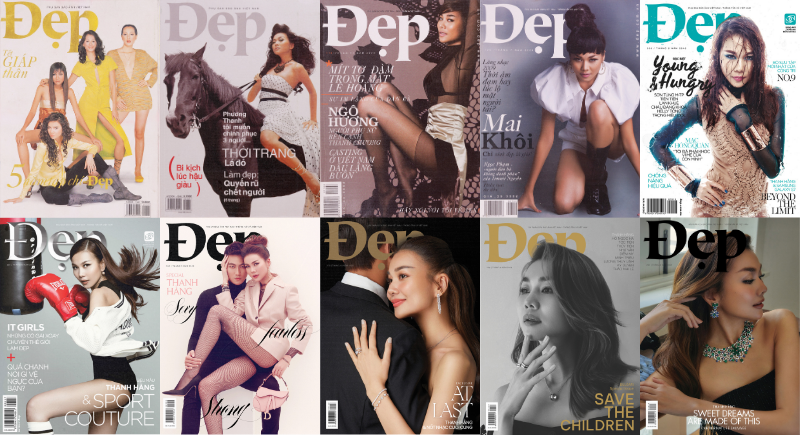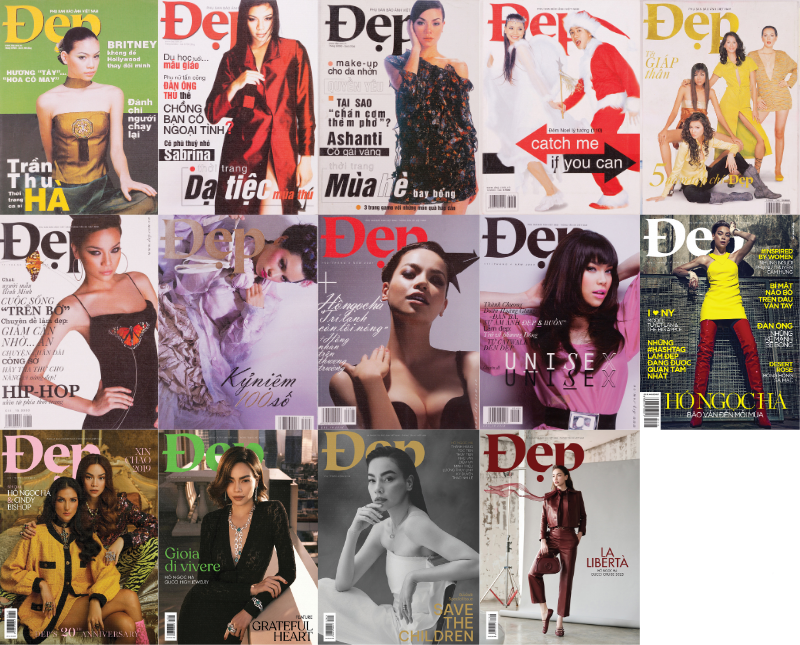 Hồ Ngọc Hà hiện dẫn đầu cuộc đua trang bìa của Đẹp với tổng cộng 14 lần góp mặt trên các ấn phẩm in. Còn nhớ, nhờ vai diễn Hương “Tây” trong “Hoa cỏ may”, Hà Hồ đã có cho mình chiếc bìa đầu tiên ngay từ khi còn là cô sinh viên trường Cao đẳng Văn hóa – Nghệ thuật Quân đội. Gần ba thập kỷ làm nghề, với tiềm năng nghệ thuật đa diện, cô luôn biết cách đổi mới mình ở mỗi lần tái xuất, từ thời trang, âm nhạc cho đến truyền hình thực tế, cho thấy danh xưng “nữ hoàng giải trí” càng chẳng phải lời cường điệu. Và như một chứng tích cho sự hiện diện mạnh mẽ của người phụ nữ này trong ngành, Đẹp đã đồng hành và lưu giữ quá trình trưởng thành ấy thông qua từng trang bìa tuyệt mỹ trải dài suốt quãng thời gian hai mươi năm.